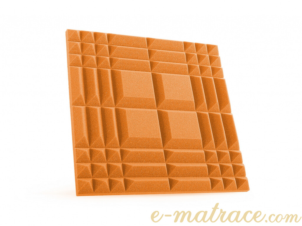 Akustická pěna jehlan v rozměrech 50x50x9 cm, 100x100x9 cm nebo 100x200x9 cm v oranžové barvě pro pohlcení zvuku v interiéru.