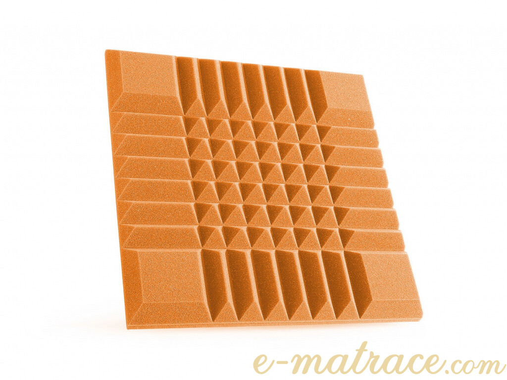 Akustická pěna Z-profil v rozměru 50x50x9 cm, 100x100x9 cm nebo 100x200x9 cm v oranžové barvě pro pohlcení zvuku v interiéru.