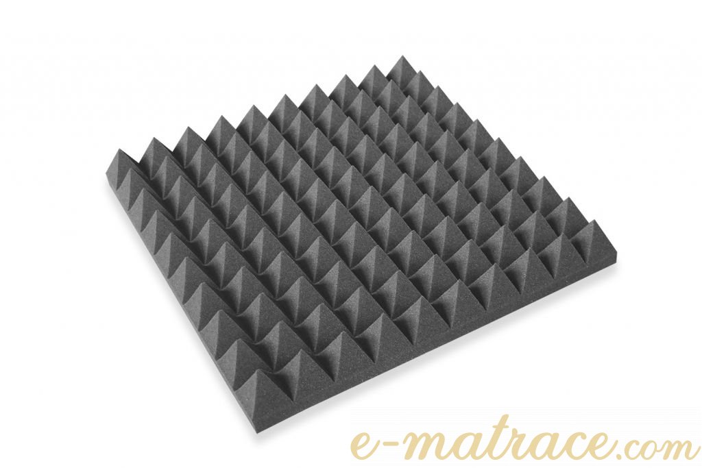 Akustická pěna jehlan v rozměrech 50x50x7 cm nebo 115x195x7 cm v grafitové barvě pro pohlcení zvuku v interiéru.