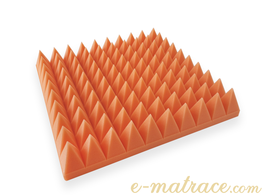 Akustická pěna jehlan v rozměrech 50x50x9 cm, 100x100x9 cm nebo 100x200x9 cm v oranžové barvě pro pohlcení zvuku v interiéru.
