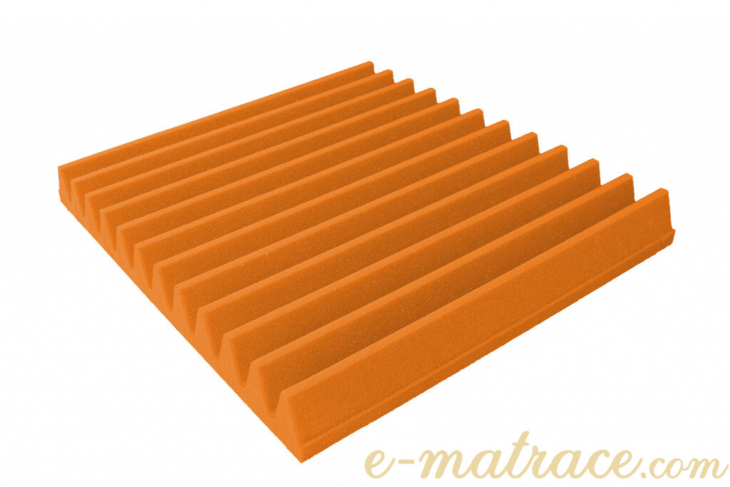 Akustická pěna Z-profil v rozměru 50x50x9 cm, 100x100x9 cm nebo 100x200x9 cm v oranžové barvě pro pohlcení zvuku v interiéru.