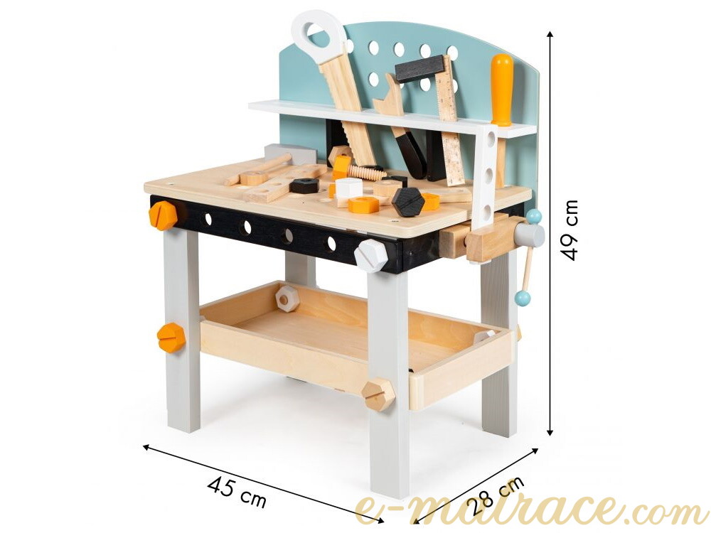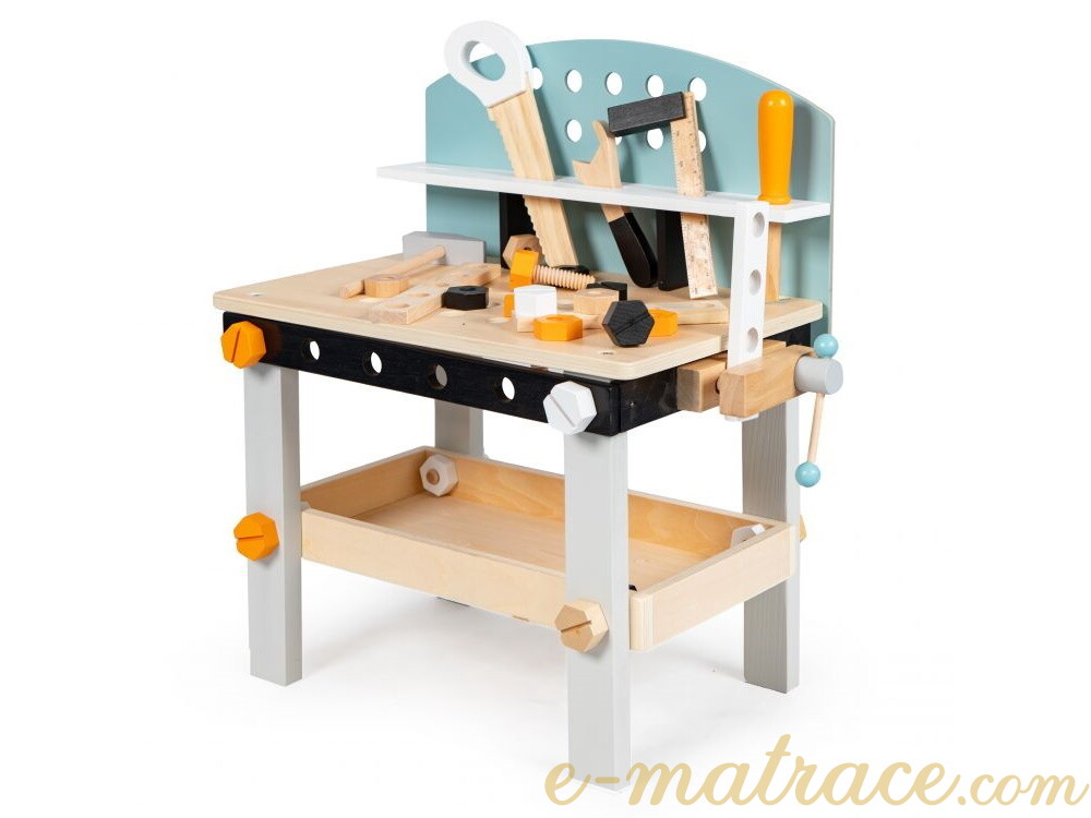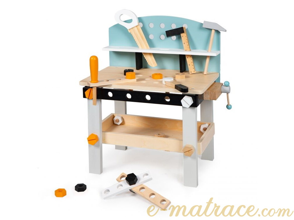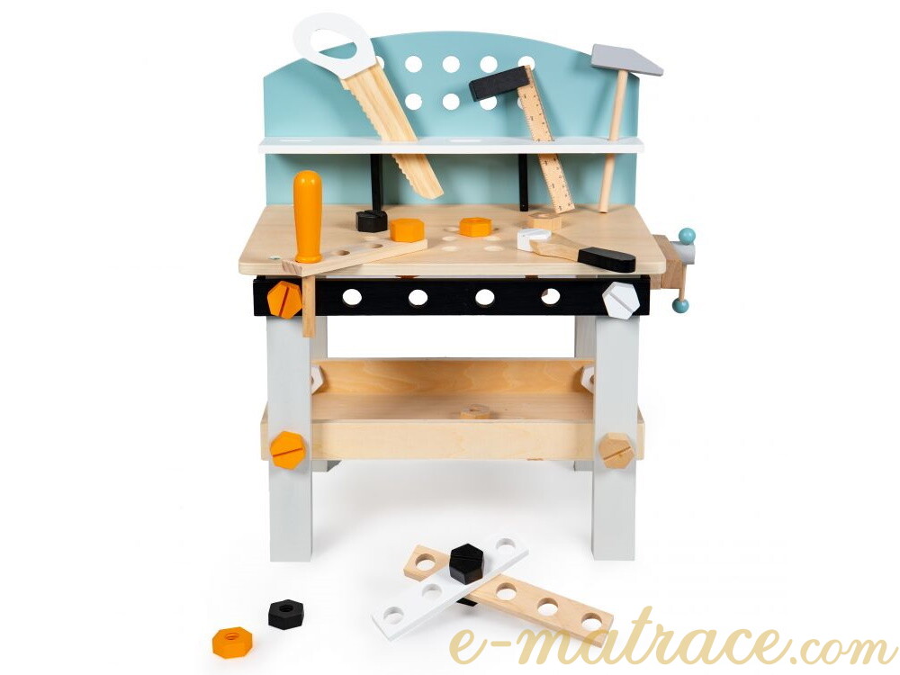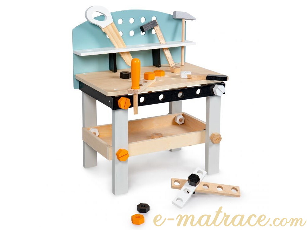 Dílnička nabízí perfektní možnost vývoje dítěte z hlediska koordinace a manuálních činností - kroucení šroubů, seřizování atd. Pracovní stůl dílny je opatřen otvory, do kterých lze přišroubovat šrouby a další prvky ze sady. Na boční straně je dostupný svěrák pro servisní práce. Pod deskou stolu se nachází police na šrouby a ostatní pracovní předměty. A protože i děti by se měly učit udržovat pořádek, pracovní nářadí je možné uklidit na horní polici dílny. Dřevěná konstrukce je stabilní, vyrobena bez ostrých hran.