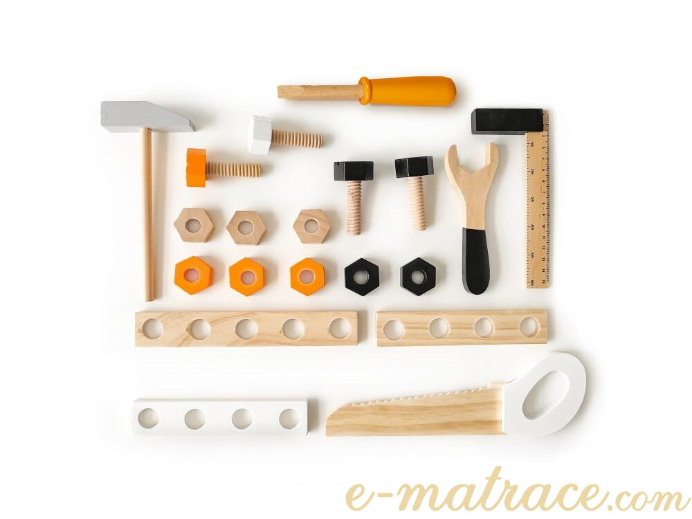 Sada nářadí obsahuje veškeré potřebné příslušenství ze dřeva - kladivo, klíč, šroubovák, šrouby, metr, a mnoho dalších.