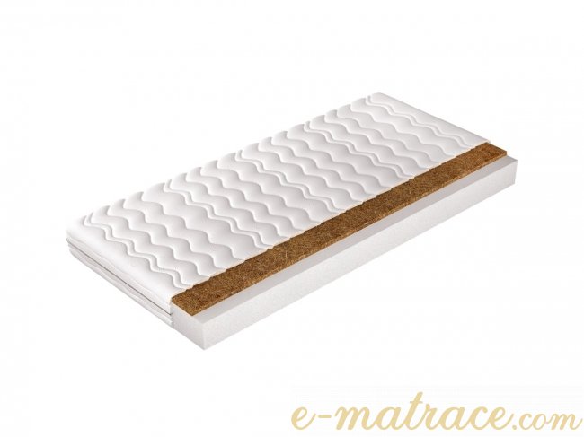 Dětská matrace Standard kokos je oboustranná matrace vhodná pro děti do 50 kg. Matrace je složená z PURZkratka názvu polyuretanové pěny, vhodné pro výrobu matrací a zvukové izolace pro její vlastnosti jako prodyšnost, tvarová stálost, dlouhá životnost a cenová dostupnost. (polyuretanové) pěny o síle 8 cm, která zajišťuje provzdušnění a má střední tuhost (3 z 5). Jádro matrace je speciálně navrženo pro uložení dětí, aby optimálně působilo protitlak vůči tělu dítěte. Z jedné strany matrace je umístěna kokosová deska o síle 1,5 cm, která se vyznačuje tvrdší tuhostí (4 z 5). Kokosová deska se vyrábí ze skořápek kokosových ořechů. Kokosová vlákna jsou propojena pružným latexem, který umožňuje kokosové desce zvýšit tuhost matrace, zároveň ale zachovat její pružnost. Díky své přírodní struktuře je kokosové vlákno lehké, prodyšné a má antialergické vlastnosti. Potah matrace je polstrovaný.