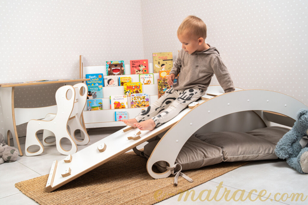 Montessori houpačka bílá MDF XXL 6v1 (skluzavka, úkryt, prolézačka, sedátko, stolek) je větší verze běžně dostupných houpaček tohoto typu.