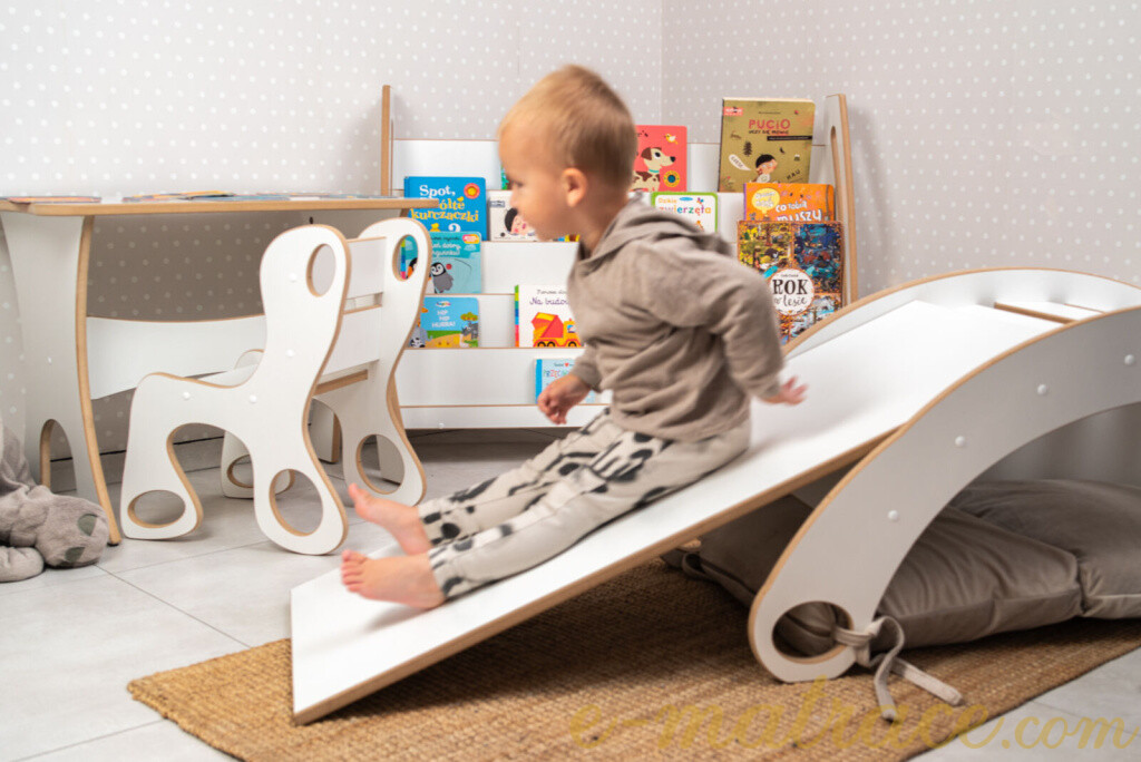 Montessori houpačka bílá MDF XXL 6v1 (skluzavka, úkryt, prolézačka, sedátko, stolek) je větší verze běžně dostupných houpaček tohoto typu.