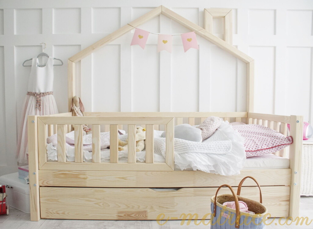 Domečková postel Bali Plotek Plus je vyrobena z lepeného borovicového dřeva 1.třídy, jenž je mnohem odolnější než klasický masiv, nepraská a nemá viditelné suky. Všechny části postele jsou zaoblené, čímž se zvyšuje její celková bezpečnost. Postel je standardně vybavena přední zábrankou do 1/2 délky postele. Zábranka je odnímatelná, v případě potřeby ji lze snadno demontovat. Součástí domečkové postele je také úložný prostor v podobě dvou výsuvných šuplíků. Šuplíky je možné nahradit výsuvnou přistýlkou s roštem, která poskytne lůžko navíc dalšímu dítěti či kamarádům. Tuto rozkládací funkci si můžete zvolit níže v bodě č. 3 "Funkce".