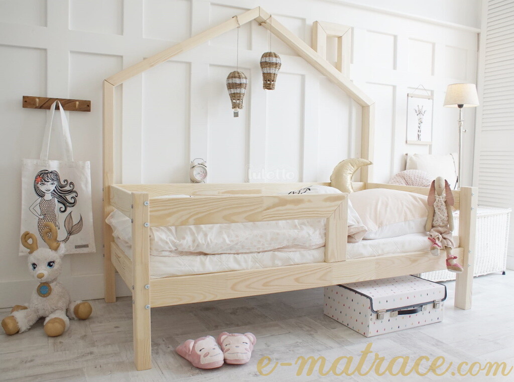 Domečková postel Bali Prosta v originálním designu s přední zábrankou a volitelnou výškou nožiček. Postel je dále možné volit v několika rozměrových variantách a barevných provedení. Součástí postele je dřevěný rošt.