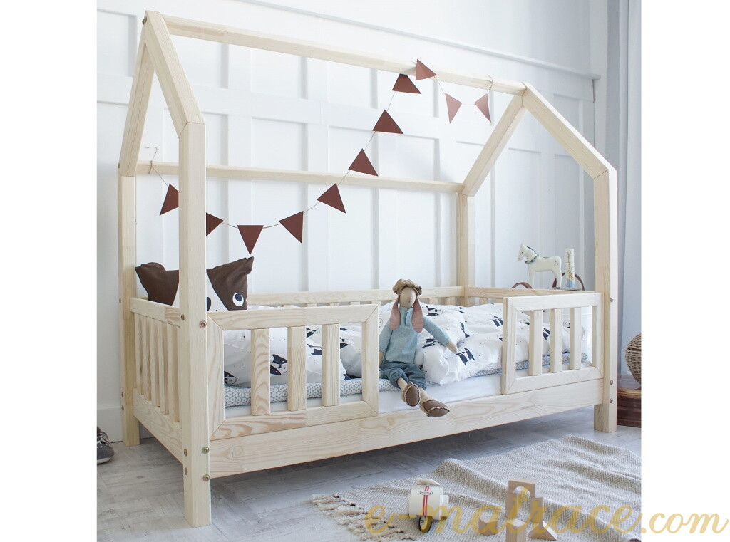 Domečková postel Bianco Duo je vyrobena z lepeného borovicového dřeva 1.třídy, jenž je mnohem odolnější než klasický masiv, nepraská a nemá viditelné suky. Všechny části postele jsou zaoblené, čímž se zvyšuje její celková bezpečnost. Postel je standardně vybavena dvěma předními zábrankami v 1/3 délky postele - obě dvě zábrany jsou tedy do 2/3 délky postele s centrálním vchodem uprostřed lůžka. Zábrany jsou odnímatelné, v případě potřeby je lze snadno demontovat. Výška nožiček je volitelnou součástí, stejně jako přítomnost dekorativního komínu na stříšce postele. Tuto domečkovou postel je možné vybrat ve třech různých rozměrech a v několika barevných provedení.