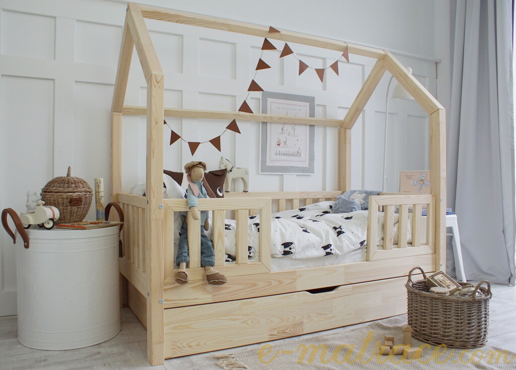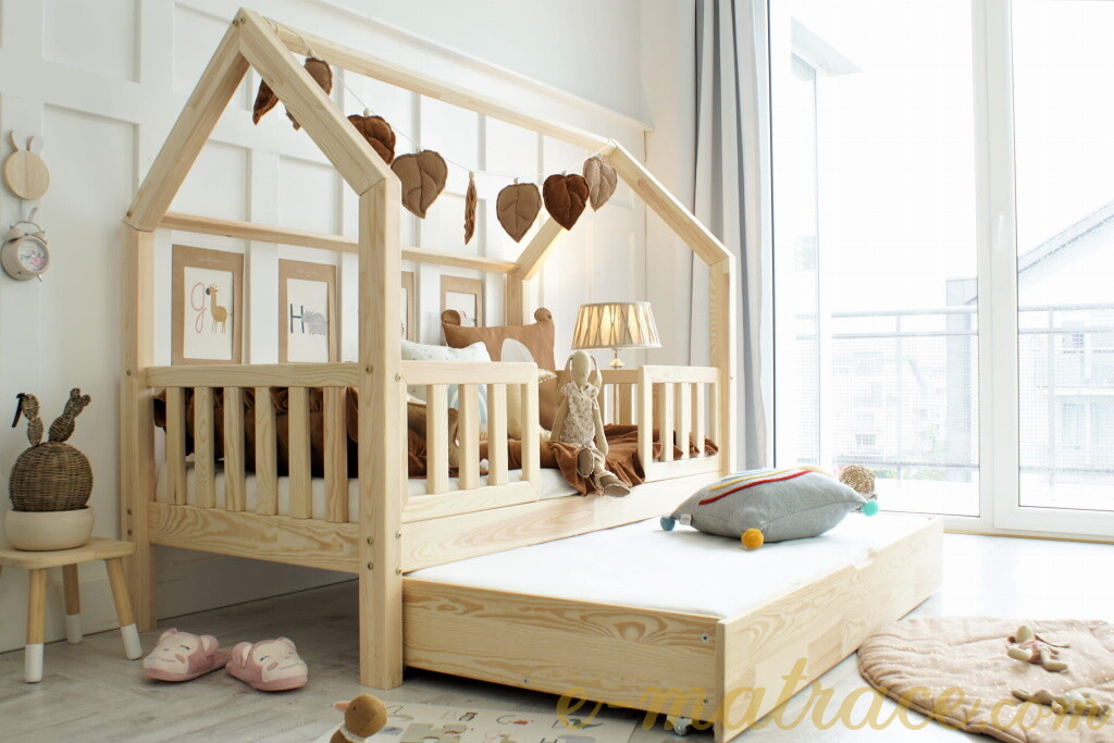 Domečková postel Bianco Duo Plus je vyrobena z lepeného borovicového dřeva 1.třídy, jenž je mnohem odolnější než klasický masiv, nepraská a nemá viditelné suky. Všechny části postele jsou zaoblené, čímž se zvyšuje její celková bezpečnost. Postel je standardně vybavena dvěma předními zábrankami v 1/3 délky postele - obě dvě zábrany jsou tedy do 2/3 délky postele s centrálním vchodem uprostřed lůžka. Zábrany jsou odnímatelné, v případě potřeby je lze snadno demontovat. Součástí domečkové postele je také úložný prostor v podobě dvou výsuvných šuplíků. Šuplíky je možné nahradit výsuvnou přistýlkou s roštem, která poskytne lůžko navíc dalšímu dítěti či kamarádům. Tuto rozkládací funkci si můžete zvolit níže v bodě č. 3 "Funkce".