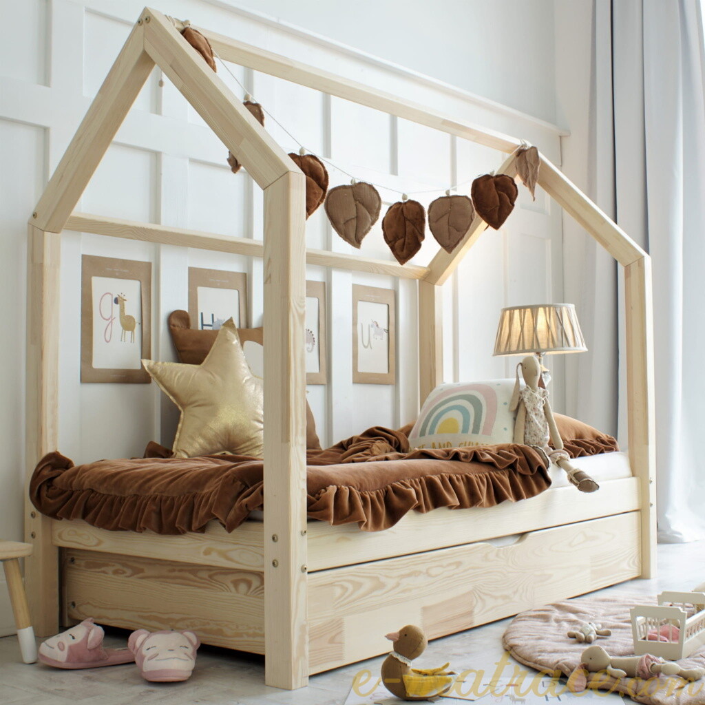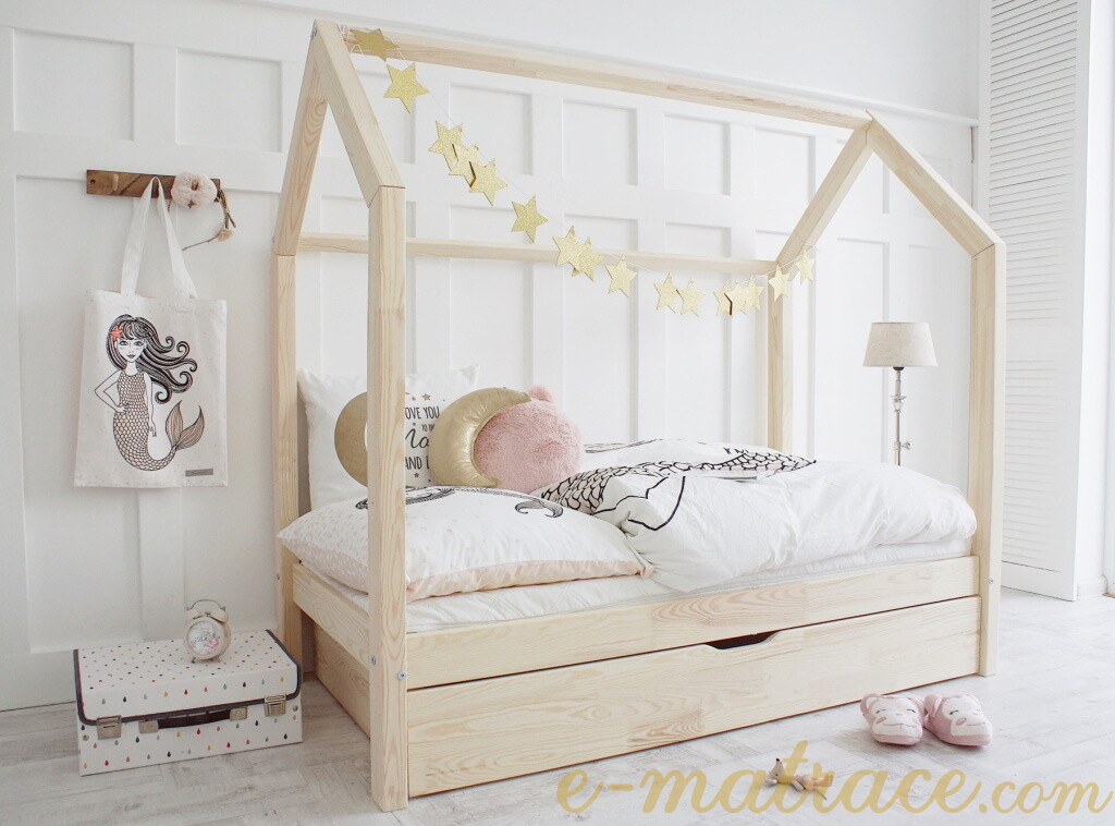 Domečková postel Classic Plus je vyrobena z lepeného borovicového dřeva 1.třídy, jenž je mnohem odolnější než klasický masiv, nepraská a nemá viditelné suky. Všechny části postele jsou zaoblené, čímž se zvyšuje její celková bezpečnost. Postel může být vybavena přední zábrankou do 1/2 délky postele (zábranka jako u domečkové postele Barriera). Tato zábrana je odnímatelná, v případě potřeby ji lze snadno demontovat. Součástí domečkové postele je také úložný prostor v podobě dvou výsuvných šuplíků. Šuplíky je možné nahradit výsuvnou přistýlkou s roštem, která poskytne lůžko navíc dalšímu dítěti či kamarádům. Tuto rozkládací funkci si můžete zvolit níže v bodě č. 3 "Funkce".