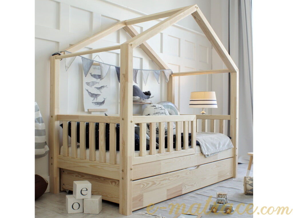 Domečková postel HouseBed Plotek Plus je vyrobena z lepeného borovicového dřeva 1.třídy, jenž je mnohem odolnější než klasický masiv, nepraská a nemá viditelné suky. Všechny části postele jsou zaoblené, čímž se zvyšuje její celková bezpečnost. Postel je standardně vybavena přední zábrankou do 1/2 délky postele. Zábranka je odnímatelná, v případě potřeby ji lze snadno demontovat. Součástí domečkové postele je také úložný prostor v podobě dvou výsuvných šuplíků. Šuplíky je možné nahradit výsuvnou přistýlkou s roštem, která poskytne lůžko navíc dalšímu dítěti či kamarádům. Tuto rozkládací funkci si můžete zvolit níže v bodě č. 3 "Funkce".