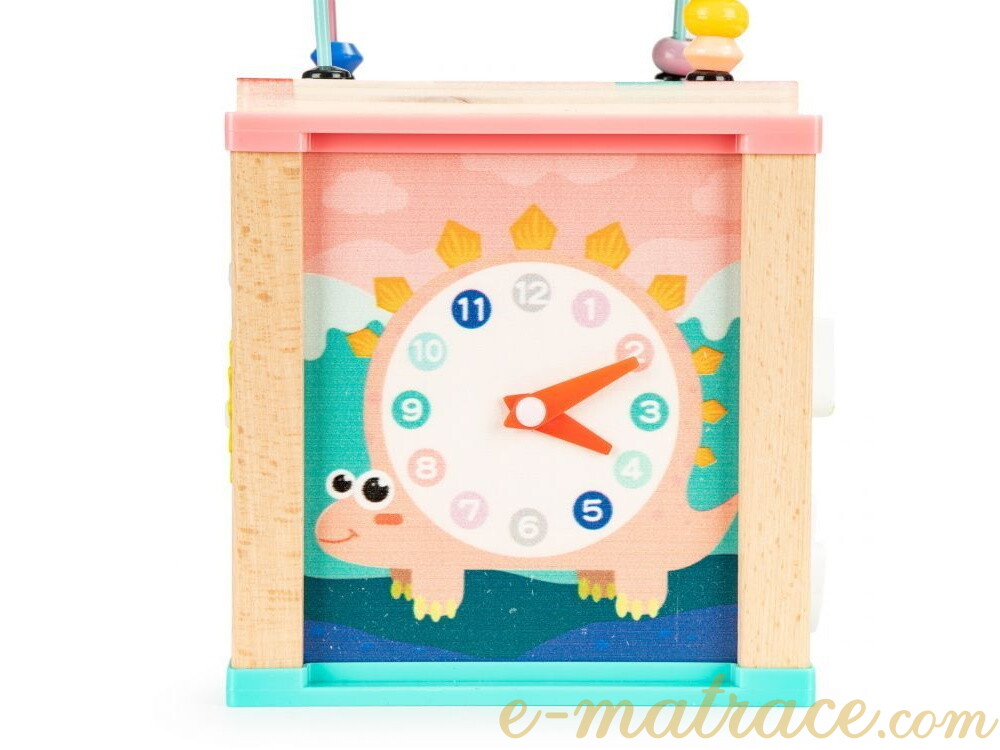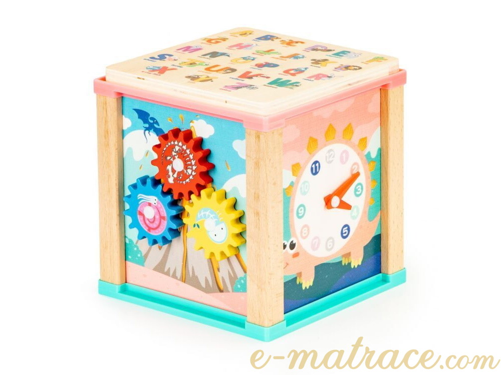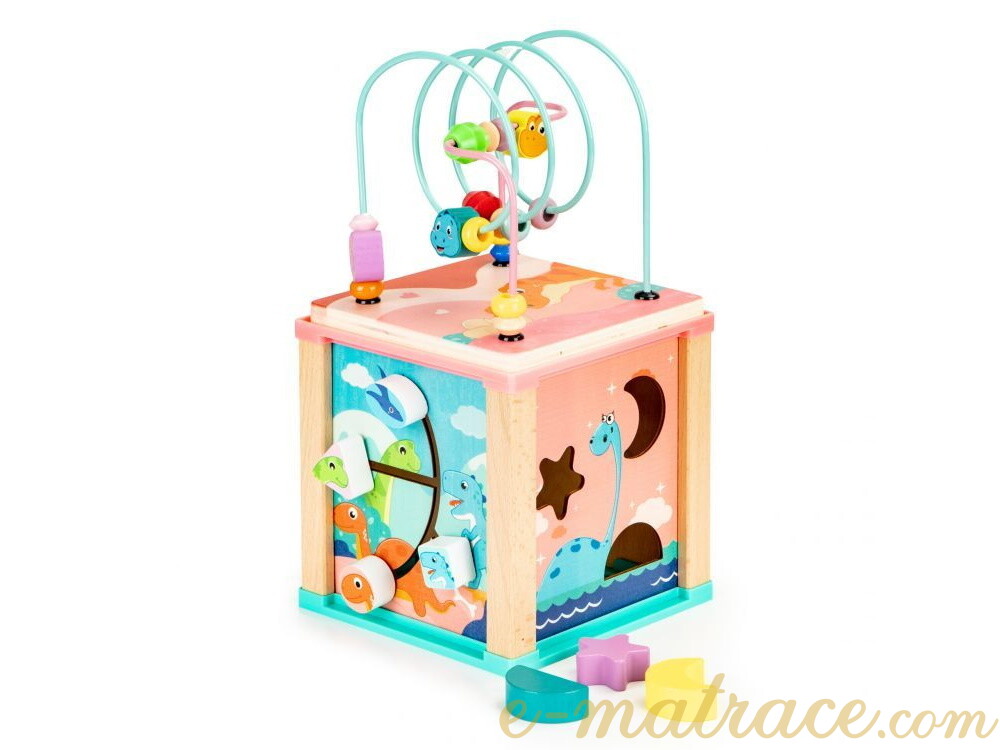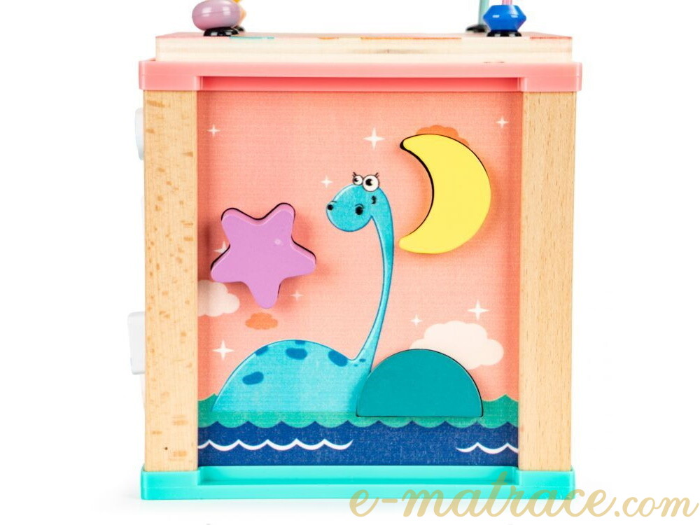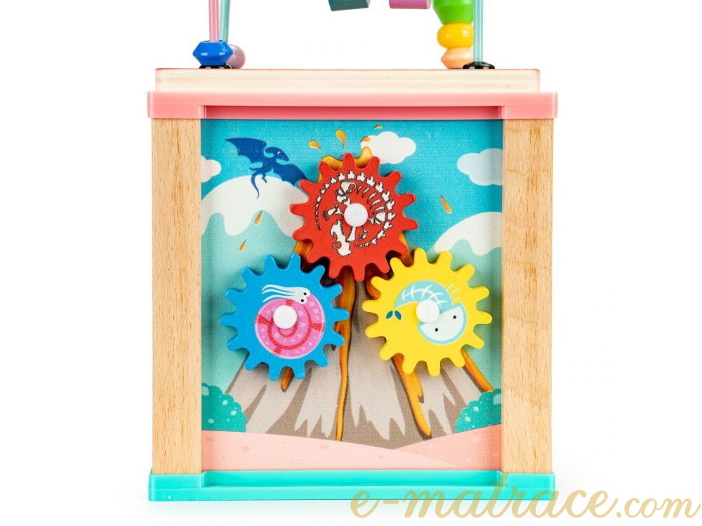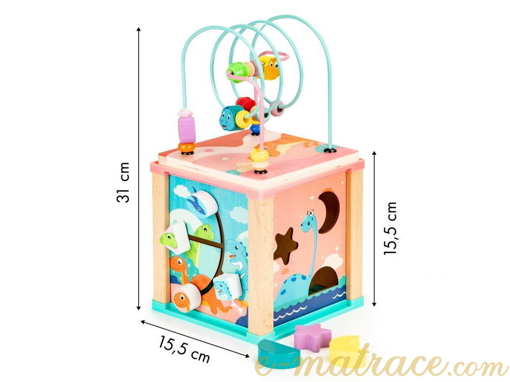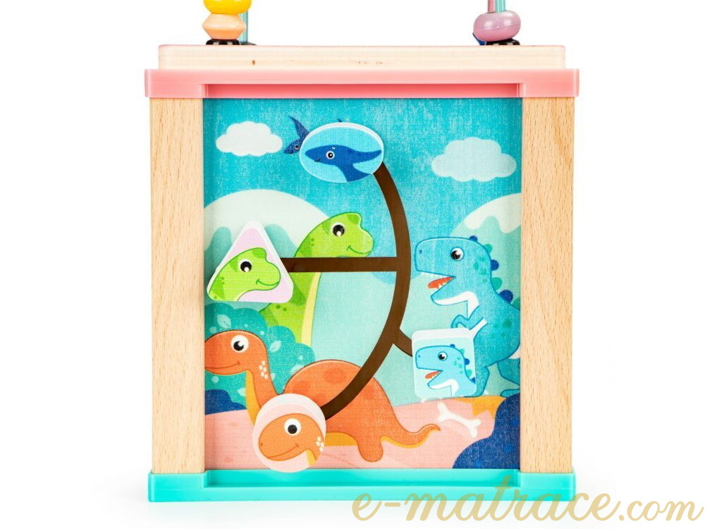 Vzdělávací hračka Dino pro děti  je plná pohyblivých prvků pro spoustu zábavy. V horní části se nachází snímatelná deska s labyrintem a barevnými korálky, které mohou děti přemisťovat z jednoho konce na druhý. Pod odnímatelnou deskou je umístěna tabule s abecedou a slovy v angličtině. Stěny jsou vybaveny dřevěnými bloky s různými interakcemi a barevnými vzory.