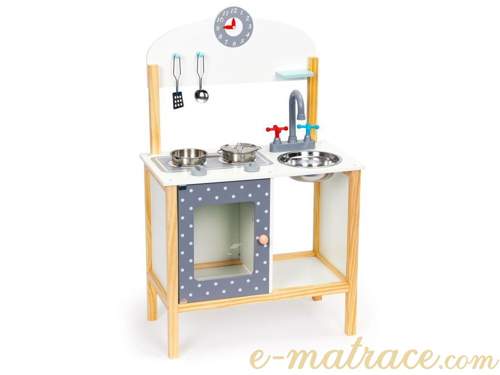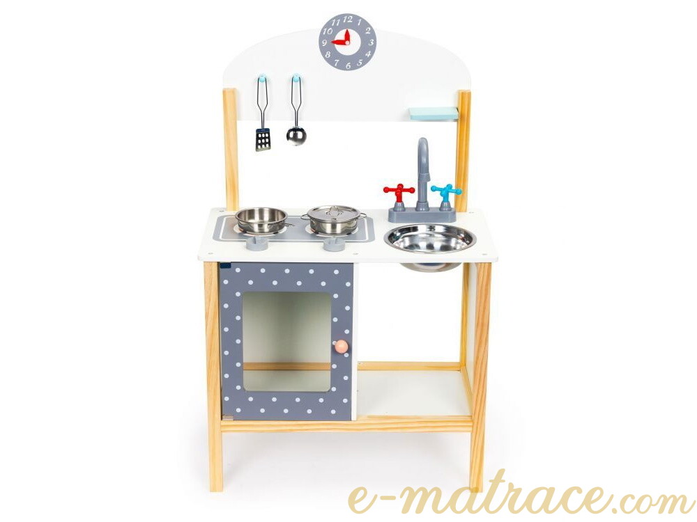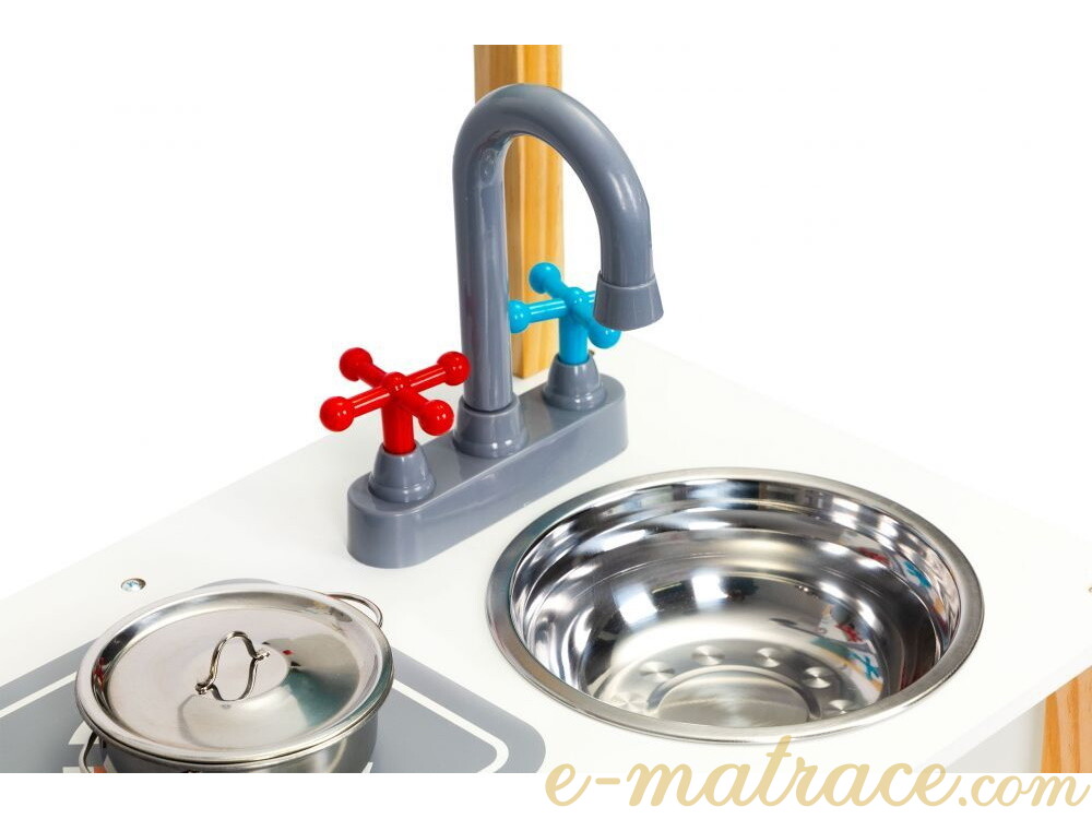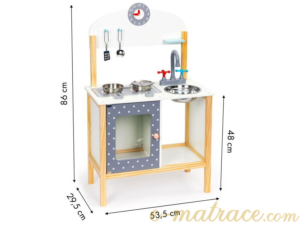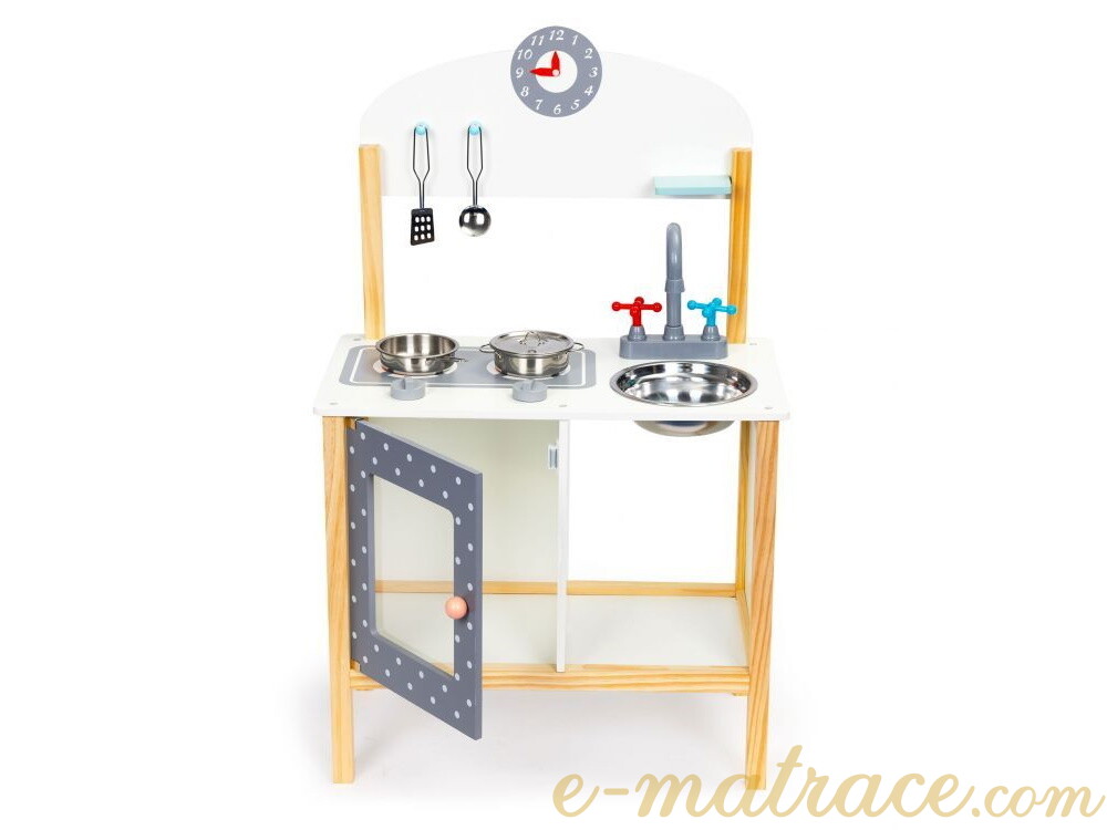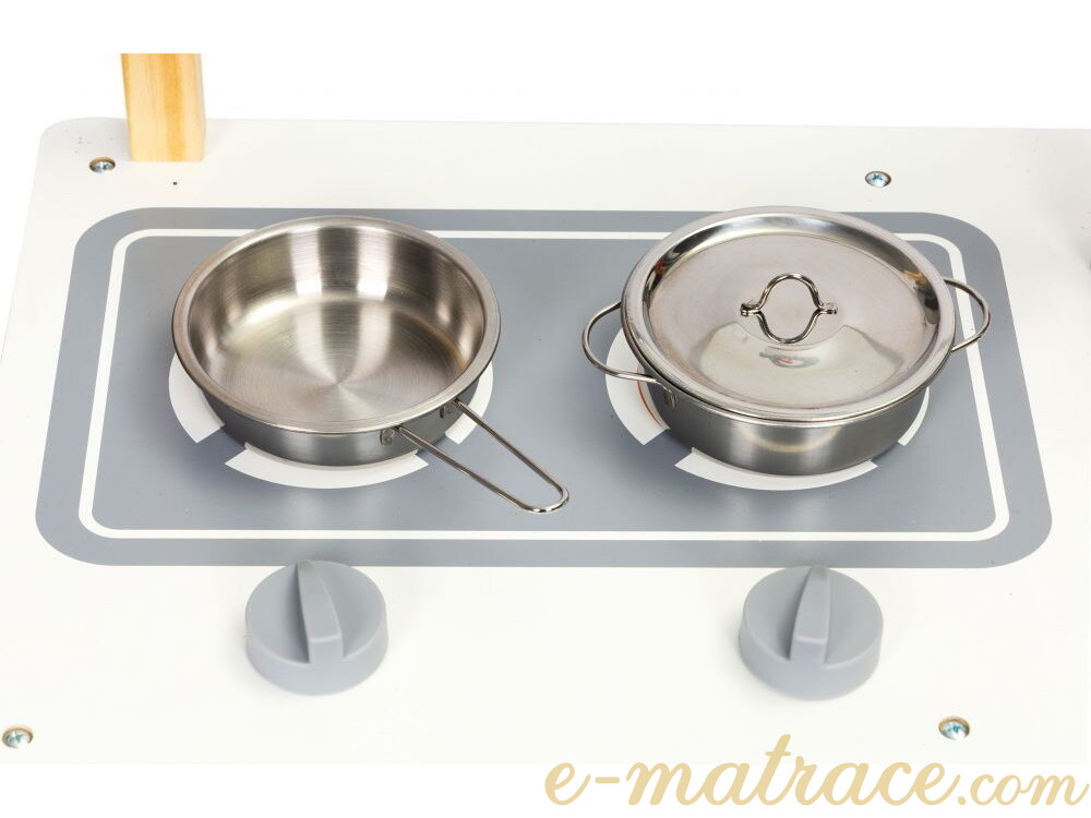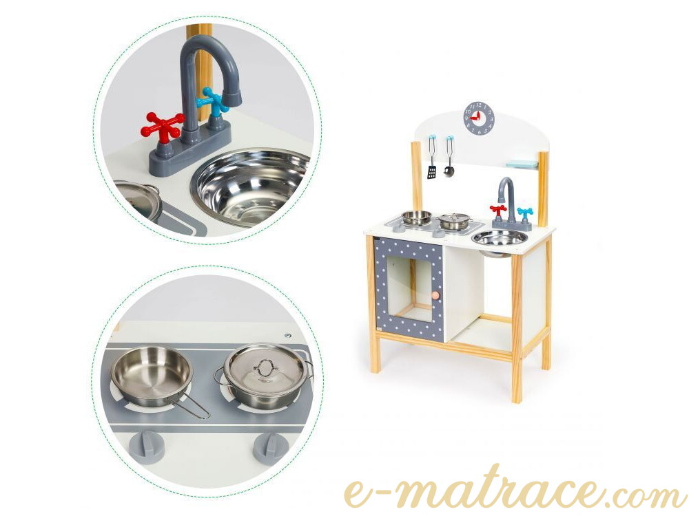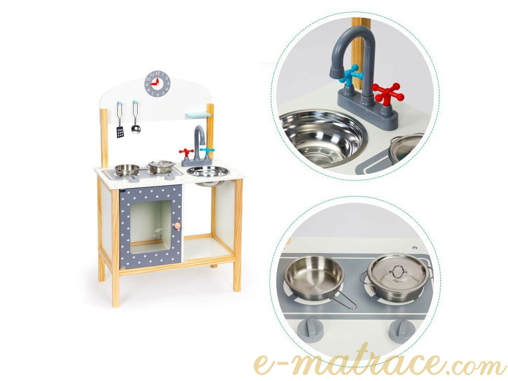 Kuchyňka pro děti nabízí vybavení jako opravdová kuchyně. V desce stolu se nachází varná deska se dvěma hořáky a dvěma spínači, které při otáčení vydávají charakteristický cvakavý zvuk. Uvnitř desky je umístěný dřez s baterií a dvěma otočnými kohoutky, kde mohou kuchaři a kuchařky umýt nádobí. A jako správná kuchyně i tato obsahuje sadu kuchyňského nádobí v podobě hrnce, poklice, pánve a 2 ks naběraček. Dřevěná kuchyňka je vyrobena bez nebezpečných prvků a ostrých hran a je pokryta bezpečnými barvami pro děti.