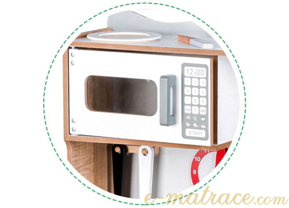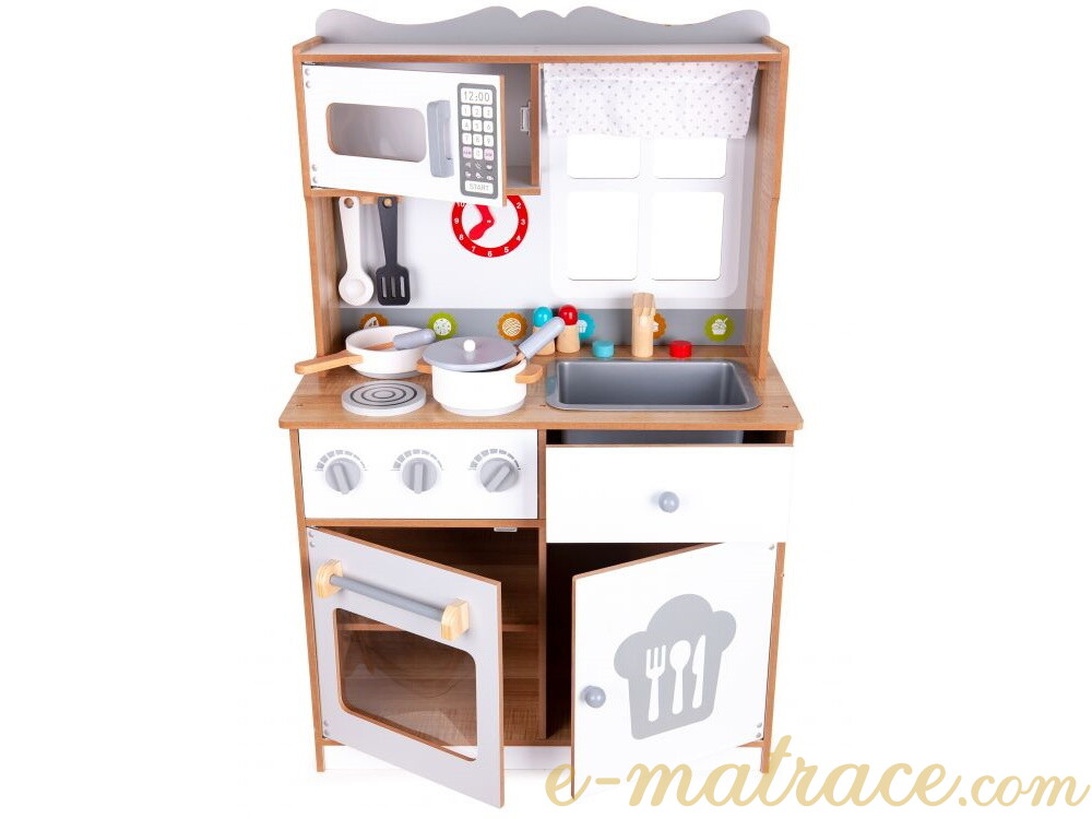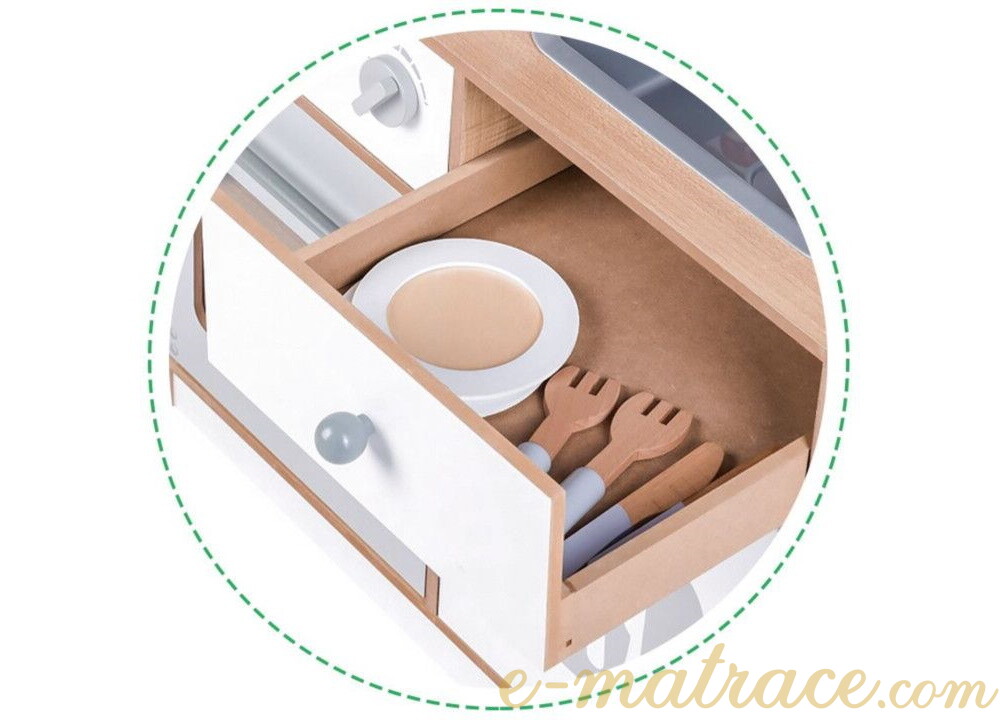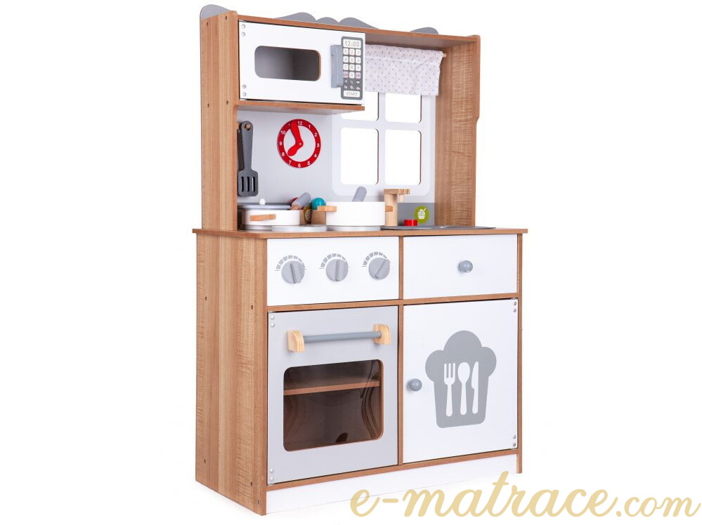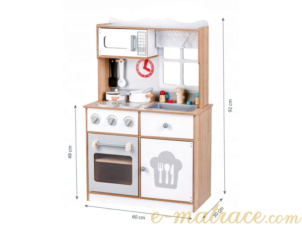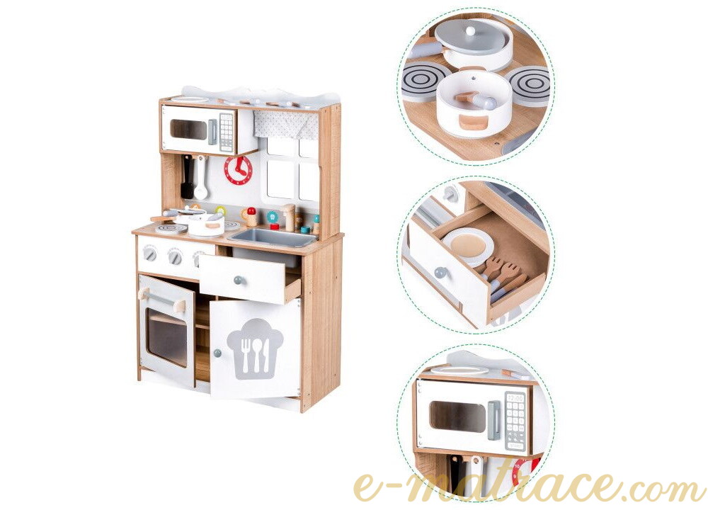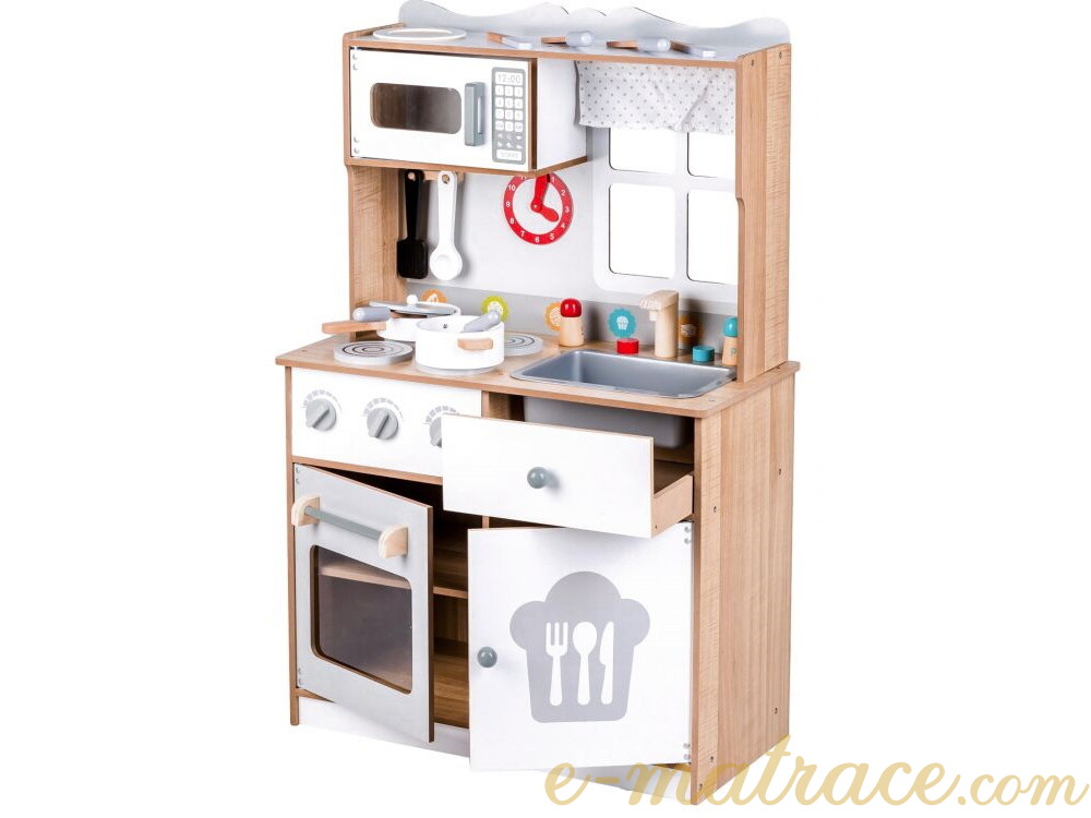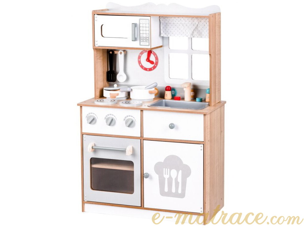 Dětská kuchyňka je skvělou volbou pro rozvíjení dětské fantazie a dovedností. Díky veškerému dostupnému vybavení nabízí kuchyňka mnoho možných činností. Sporák je vybaven třemi hořáky a troubou. Hořáky při otáčení vydávají charakteristický cvakaví zvuk. Malý kuchař nebo malá kuchařka může péct, vařit a ohřívat pokrm v mikrovlnné troubě zároveň. Po uvaření mohou všechno nádobí umýt v prostorném dřezu a nádobí uklidit zpět do úložného prostoru. Veškeré skříňky mají magnetický systém, který zabraňuje jejich náhodnému otevření. Všechny dřevěné prvky jsou pokryty barvou, která je pro děti zcela bezpečná.