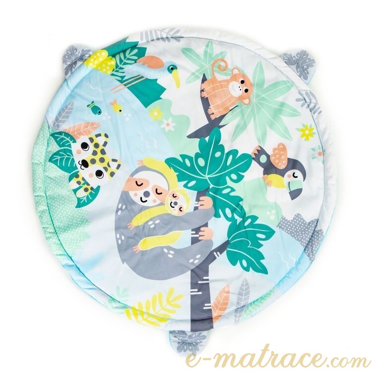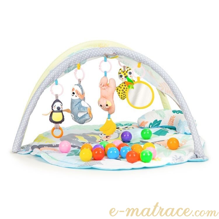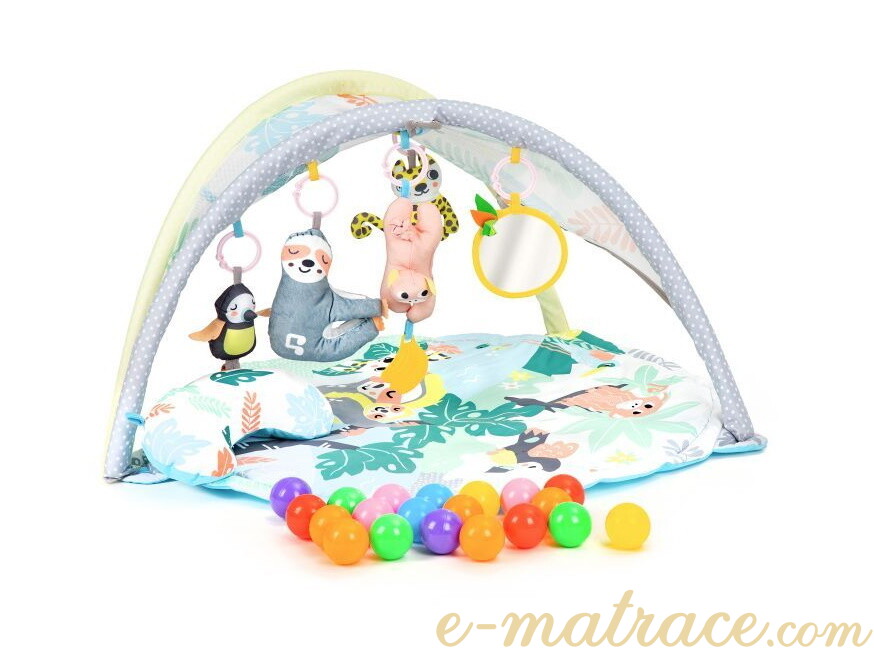 Hrací deka Lenochod s pohodlným polštářem, hračkami a barevnými míčky. Ideální pro rozvíjení motoriky a přitáhnutí dětské pozornosti. Vhodné pro děti od prvních dní věku.