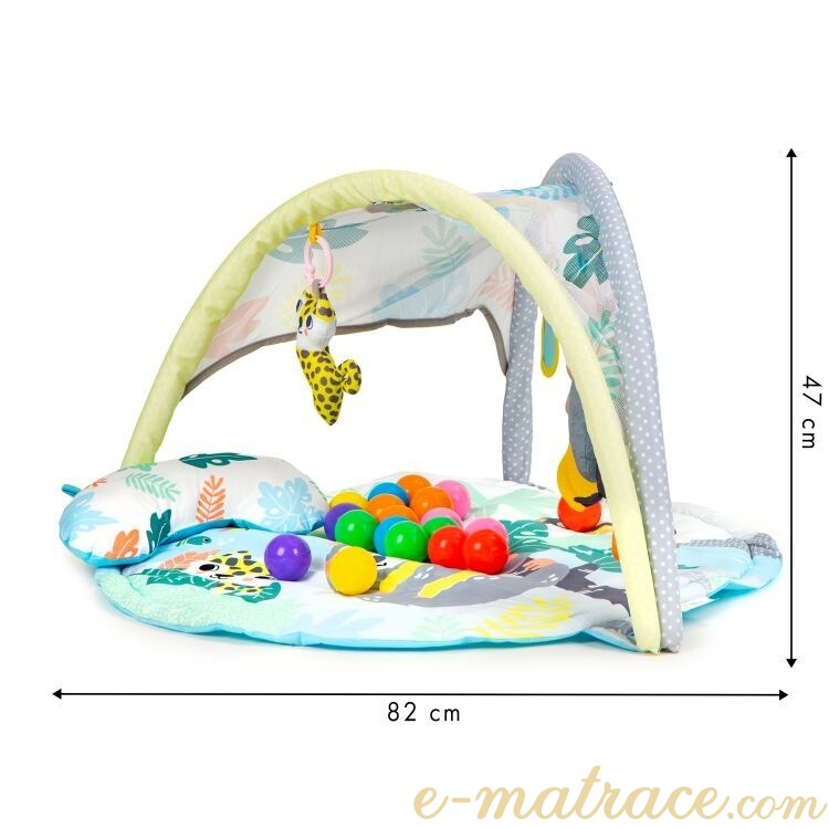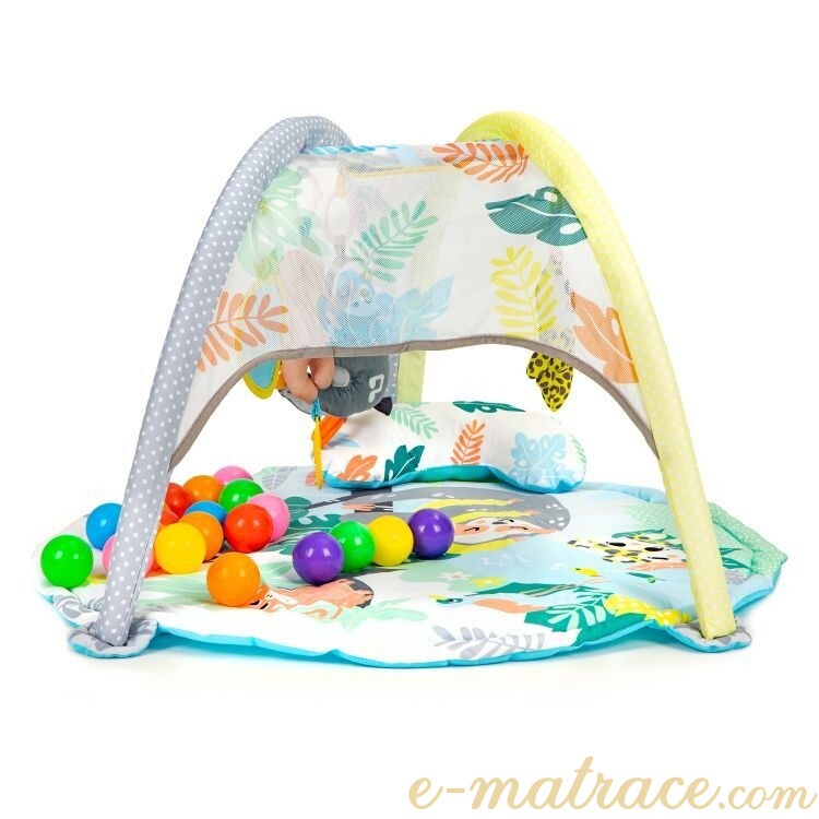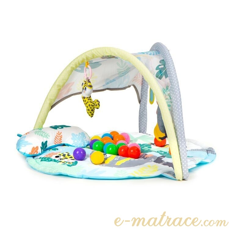 Měkoučký polštář hrací podložky zajistí dětem příjemný komfort při ležení. Zavěšené hračky rozvíjí manuální a motorické dovednosti a stimulují vývoj. Jedna z hraček hraje melodii. Součástí sady jsou také barevné míčky pro maximální zábavu. Hrací deka je navíc vyrobena v příjemných barvách, které nikdy neomrzí.