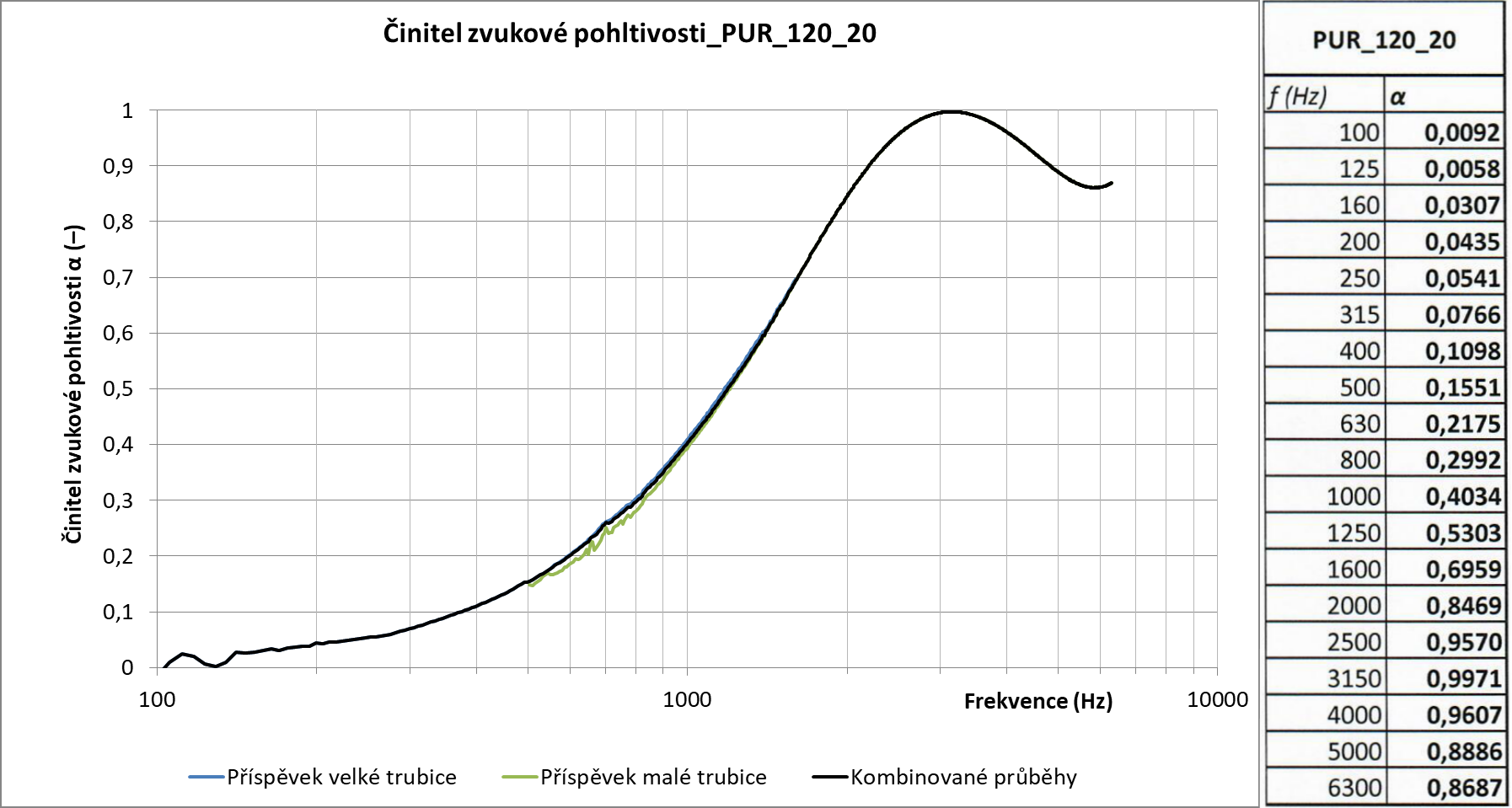 Graf zvukové pohltivosti byl měřen pro objemovou hmostnost 120 kg/m3 o síle 2 cm, od nabízené varianty 140 kg/m3 - 5 cm se může lišit. Se sílou materiálu se pohltivost zlepšuje. Toto jsou minimální parametry, kterých materiál dosahuje. Měření pro 140 kg/m3 bohužel momentálně nemáme k dispozici.