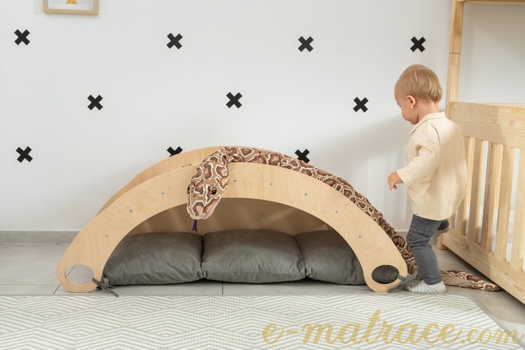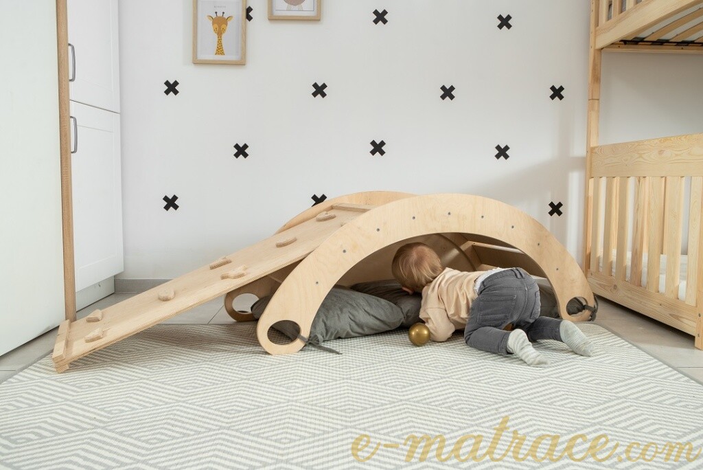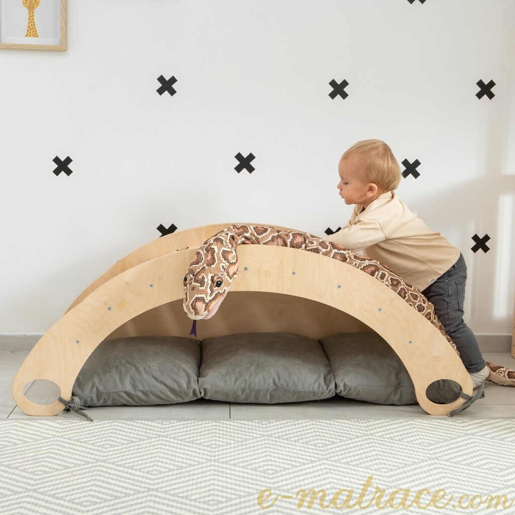 Montessori houpačka NATURAL XXL 6v1 (skluzavka, úkryt, prolézačka, sedátko, stolek) je větší verze běžně dostupných houpaček tohoto typu.