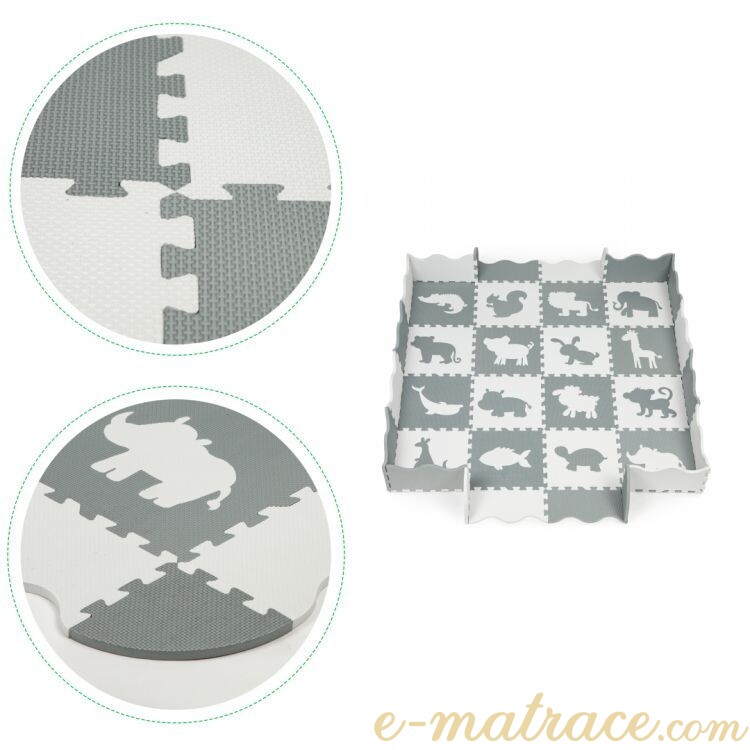 Pěnové puzzle má speciální protiskluzovou texturu, která tlumí pády a je příjemně měkká na dotek. Sada puzzle se skládá z 16 čtverců a 20 doplňkových bočních prvků. Okraje jednotlivých částí mají speciální výřezy, díky kterým je možné prvky libovolně kombinovat. Podložku je navíc možné "uzavřít" a vytvořit tak suchý bazének na hraní. Stačí do něj nasypat barevné míčky (nejsou součástí) nebo jiné hračky. Z podložky je také možné postavit kostky, které si dítě může samo vytvořit.