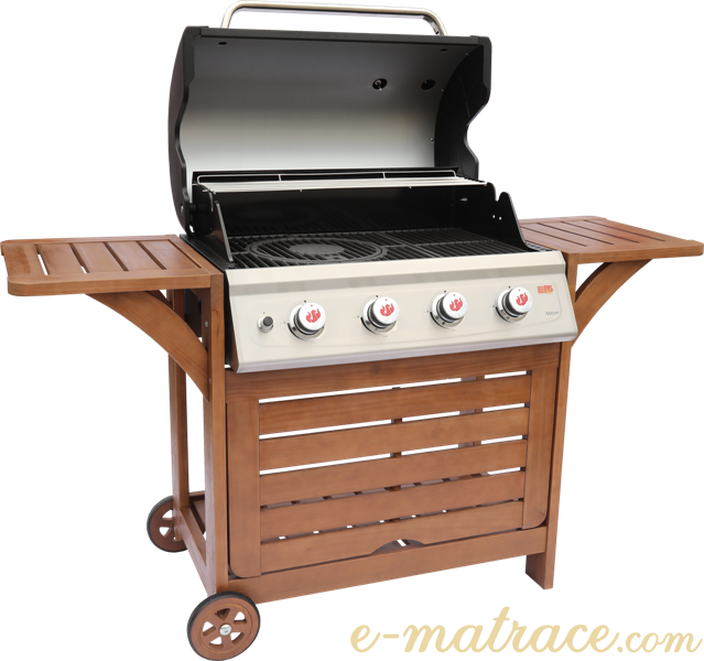 Kvalitní plynový gril Miton s dřevěnou základnou a celkem čtyřmi hořáky, odkládací plochou na bočních stranách, víkem grilu s teploměrem a kolečky. Kapacita grilu až 14 osob.