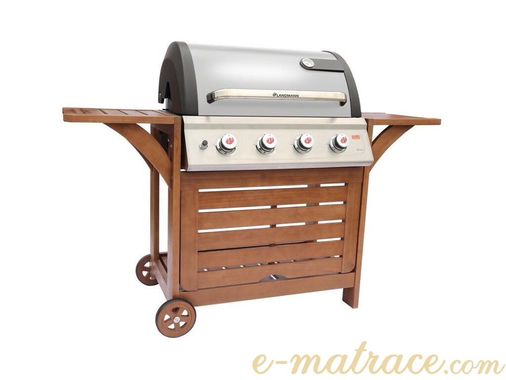 Gril je vyroben z kombinace lakovaného ocelového plechu a leštěné nerezové oceli s inovativním systémem PTS. Grilovací rošt a grilovací deska jsou vyrobeny z kvalitní smaltované litiny, ohřívací mřížka pak z nerezové oceli. Gril disponuje čtyřmi nezávislými hořáky se smaltovanými kryty o výkonu 3,5 kW, piezo zapalování pro každý hořák. Nechybí ani odkapávací miska na vypečený tuk a teploměr ve víku grilu. Dřevěná základna grilu obohatí nejen jeho celkový vzhled, ale také umožní přípravu pokrmů na odkládacích bočních policích a poskytne úložný prostor pod grilem. Pro snadnější manipulaci je gril vybaven kolečky. Plynová hadice a regulátor jsou součástí balení.