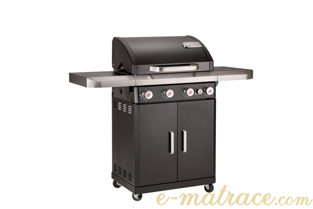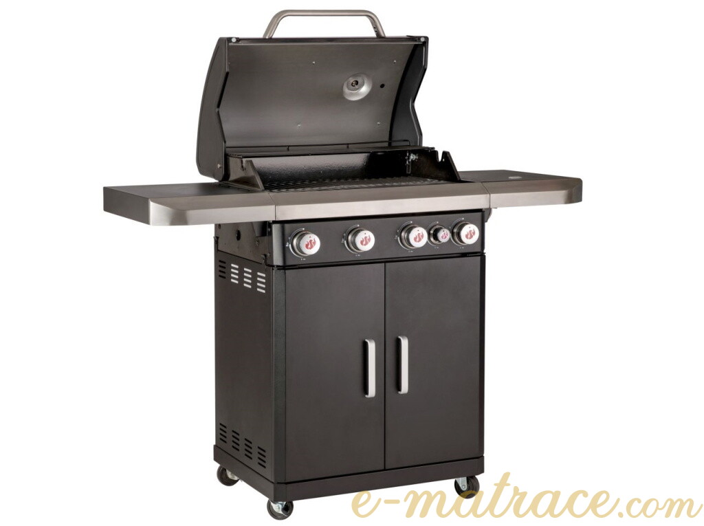 Konstrukce plynového grilu je vyrobena v kombinaci lakovaného / smaltovaného ocelového plechu a broušené nerezové oceli. Gril disponuje patentovaným systémem rovnoměrného vyzařování teploty PTS s výkonem 15 kW. Čtyři nezávislé hlavní hořáky z nerezové oceli s dlouhou životností (4x3,0 kW) + jeden extra hořák na vaření příloh (3,0 kW). Hořáky disponují piezo zapalováním pro snadné zažehnutí plamene. Modulární litinový rošt nabídne grilovací plochu o rozměru 65x40 cm a zajistí maximální využitelnost při grilování. Nechybí ani odkapávací miska s výsuvnou nádobkou na přebytečný tuk. Víko grilu je opatřeno teploměrem pro kontrolu ideální teploty. Do uzavíratelné spodní skříňky lze umístit 11 kg plynovou lahev. Perfektní gril až pro 12 strávníků.