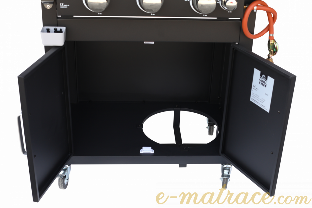 Plynový gril Trendy L se čtyřmi hořáky, a to tři hlavní a jeden boční hořák na vaření. Gril s odkládací plochou, úložným prostorem, otvírákem na lahve a víkem s teploměrem.