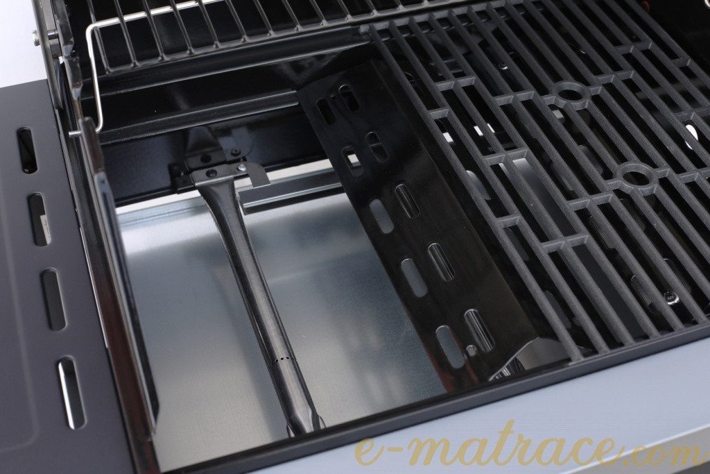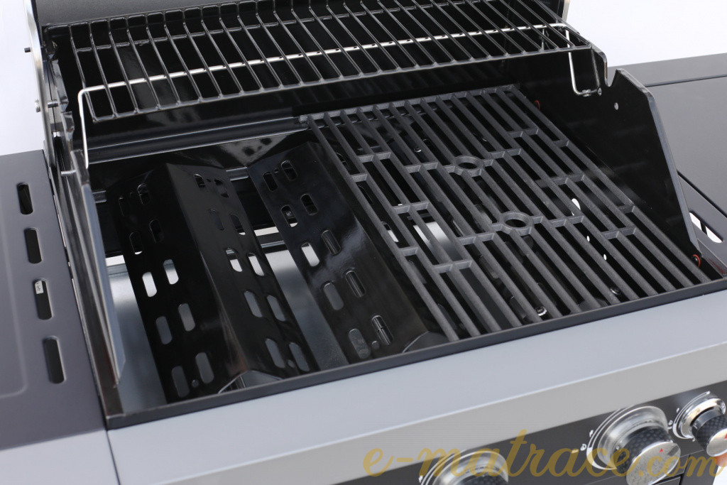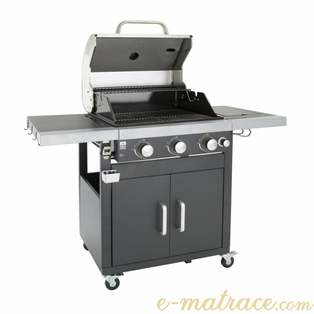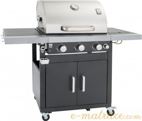 Plynový gril je vyroben z kombinace lakovaného / smaltovaného ocelového plechu a nerezové oceli. Spalovací komora je odolná vůči vysokým teplotám. Dále gril disponuje odkládací plochou a otvírákem na lahve. Gril obsahuje tři nezávislé hlavní hořáky z nerezové oceli a jeden boční hořák na vaření. Použité piezo zapalování integrované v každém z otočných knoflíků Vám usnadní rozdělávání plamene. Při výrobě tohoto grilu se dbalo na kvalitní zpracování, víko disponuje velkým nerezovým madlem a je osazeno teploměrem. Pro snadnou manipulaci je gril vybaven kolečky.