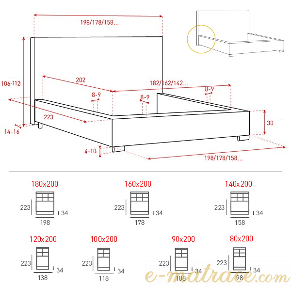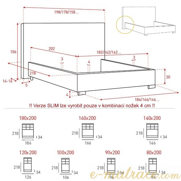 Kromě rozměru a potahu postele lze také zvolit vzhled nožek u postele. Na výběr máte buď chromové nebo dřevěné nožky s různou výškou, která je buď 4 cm (pro modely C4, G4, F4) nebo 10 cm (pro modely A10, B10, D10, E10), při zvolení varianty s nožkami o výšce 10 se zvedne výška uložení roštu a čela postele o 6cm. Další výhodou postele je možnost volby síly boků, které nabízíme v klasické standardní verzi nebo ve verzi slim, kdy jsou boky postele zúženy. Pokud Vám nevyhovuje standardní výška čela postele 106 cm, lze čelo postele buď zvýšit na 120 cm za poplatek, nebo snížit na 86 cm bez doplatku.