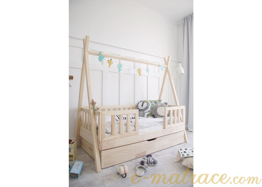 Postel Tipi Duo Plus je vyrobena z lepeného borovicového dřeva 1.třídy, jenž je mnohem odolnější než klasický masiv, nepraská a nemá viditelné suky. Její nevšední nadčasový tvar Tipi / Teepee umožní dětem postel různě ozdobit nebo zavěsit třeba lampičku. Všechny části postele jsou zaoblené, čímž se zvyšuje její celková bezpečnost. Postel je standardně vybavena dvěma předními zábrankami v 1/3 délky postele - obě dvě zábrany jsou tedy do 2/3 délky postele s centrálním vchodem uprostřed lůžka. Zábrany jsou odnímatelné, v případě potřeby je lze snadno demontovat. Součástí postele je také úložný prostor v podobě dvou výsuvných šuplíků. Šuplíky je možné nahradit výsuvnou přistýlkou s roštem, která poskytne lůžko navíc dalšímu dítěti či kamarádům. Tuto rozkládací funkci si můžete zvolit níže v bodě č. 3 "Funkce".
