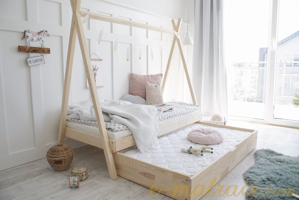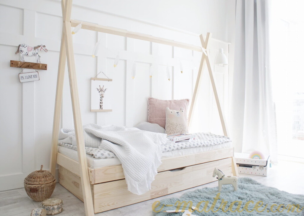 Postel Tipi Plus je vyrobena z lepeného borovicového dřeva 1.třídy, jenž je mnohem odolnější než klasický masiv, nepraská a nemá viditelné suky. Její nevšední nadčasový tvar Tipi / Teepee umožní dětem postel různě ozdobit nebo zavěsit třeba lampičku. Vzhledem k absenci postranních bočnic je postel vhodná pro děti, které se již bez těchto zábran obejdou (v nabídce naleznete také variantu postele Tipi se zábrankami). Součástí postele je také úložný prostor v podobě dvou výsuvných šuplíků. Šuplíky je možné nahradit výsuvnou přistýlkou s roštem, která poskytne lůžko navíc dalšímu dítěti či kamarádům. Tuto rozkládací funkci si můžete zvolit níže v bodě č. 3 "Funkce".