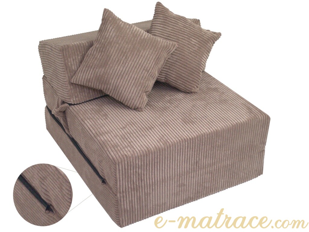 Jádro rozkládacího křesla je vyrobené z odolné PUR pěny. Svou tloušťkou 15 cm a nosností do 120 kg zajistí dostatečný komfort pro všechny typy postav. Jednoduché rozložení a složení, podle toho co v danou situaci potřebujete. Tvarovaná opěrka s jemným sklonem je příjemná k sezení i spaní. Potah je vyroben z vysoce kvalitní polstrované textílie, v případě znečištění ho lze sejmout pomocí zipu a vyprat v pračce při 30°C. Na výběr je mnoho barevných a vzorových variací.