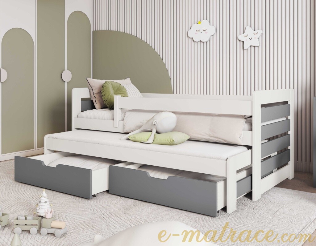 Vyobrazená barva postele: šedý akryl, grafit akryl, se zábrankou. Rozkládací postel s výsuvným druhým lůžkem z lakovaného borovicového masivu. Postel má úložné prostory v podobě výsuvných šuplíků, které lze využít k uskladnění lůžkovin či dalších věcí. Maximální doporučené zatížení hlavního lůžka je 120 kg a 100 kg pro výsuvné lůžko.