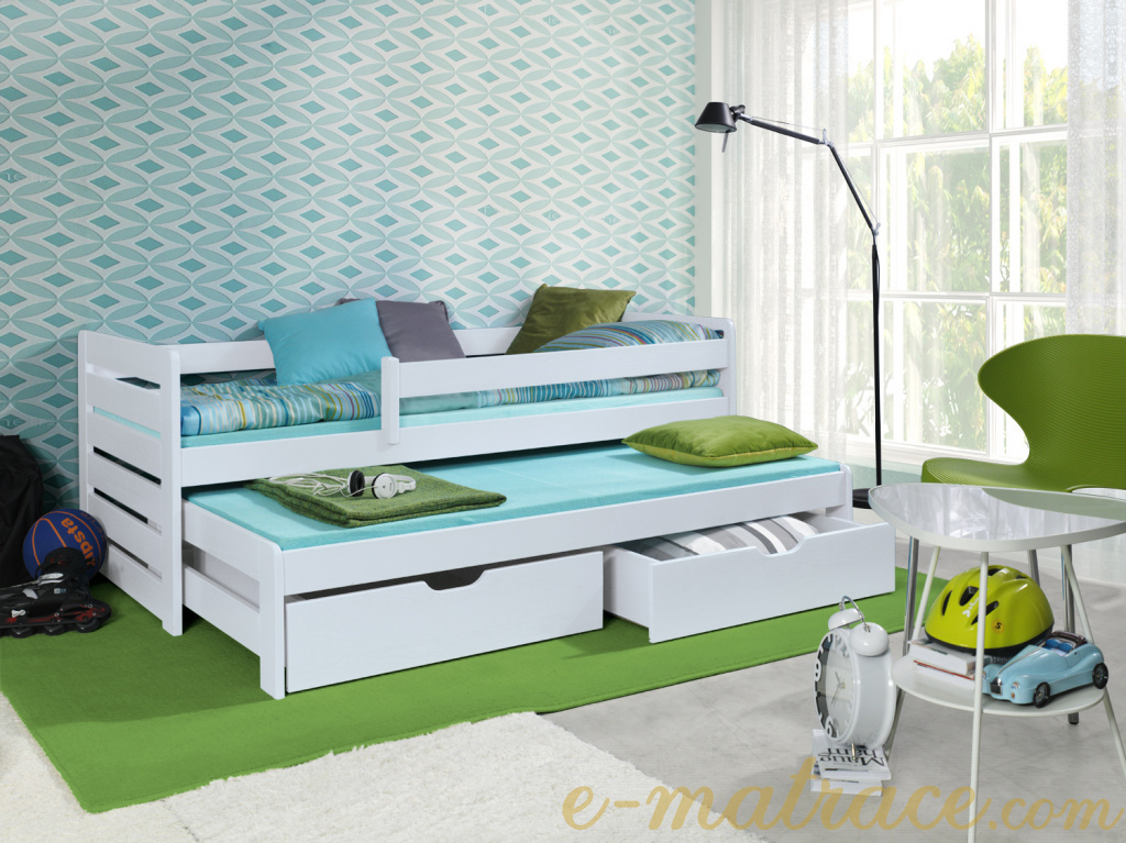 Rozkládací postel s úložným prostorem a druhým výsuvným lůžkem je vhodná do dětských a studentských pokojů pro dvě děti. Zábranku lze umístit vlevo či vpravo, umístění si lze zvolit během montáže. Největší výhodou je úspora místa, kdy rodiny s dvěma dětmi nemají prostor na dvě jednolůžkové postele nebo chtějí v dětském pokoji ušetřit místo na další nábytek či doplňky. Výsuvné druhé lůžko může také posloužit k přespání kamarádů nebo návštěv. Tato rozkládací postel s úložným prostorem se vyrábí v rozměrech 60x120 cm pro nejmenší děti, 70x160 cm pro větší děti a klasické rozměry pro studenty a dospělé 80x180 cm, 80x200 cm a 90x200 cm.