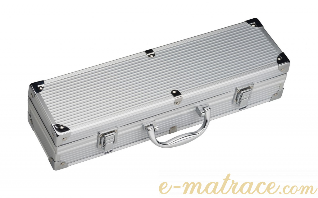 Kvalitní sada grilovacích nástrojů v hliníkový kufříku skládající se z obraceče, kleští a kartáče na čištění.