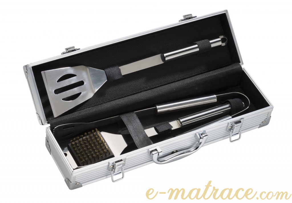 Sada grilovacích nástrojů z nerezové oceli skládající se z obraceče, kleští a kartáče na čistění, kterou ocení každý mistr grilu. Rukojeť chrání před popálením a výborně se drží v ruce. Obracečka Vám poslouží k obracení steaků a hamburgerů, kleštěmi si pohodlně obrátíte zeleninu nebo klobásky a kvalitním katáčem vyčistíte svůj gril. Celá sada je vložena do transportního hliníkového kufříku.