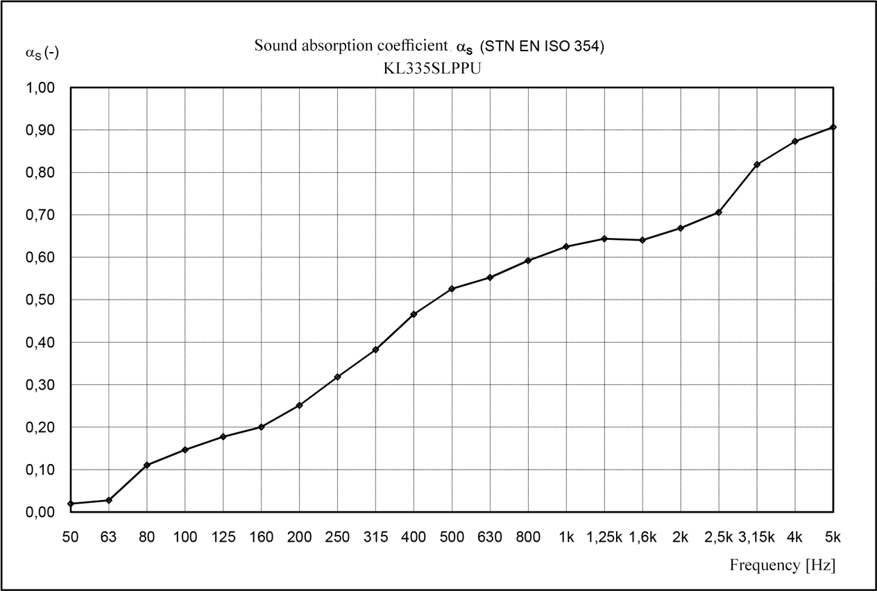 | Graf akustické pohltivosti v závislosti na frekvenci. STANDARDNÍ PUR. | Graf akustické pohltivosti v závislosti na frekvenci. SAMOZHÁŠIVÁ PUR. |