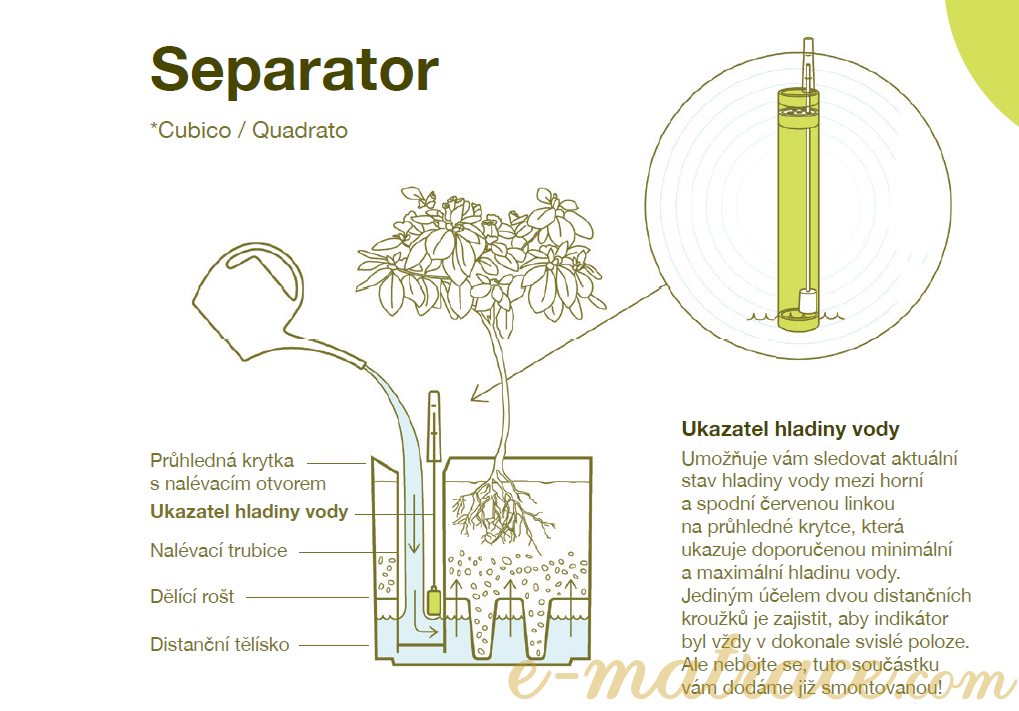 Samozavlažovací květináč Cubico 42 je vybaven samozavlažovacím systémem Separator. Toto samozavlažování umožňuje sledovat aktuální stav hladiny vody a také doporučenou maximální a minimální hladinu vody. Součástí květináče je dělící rošt, nalévací trubice a ukazatel hladiny vody. Květináč neobsahuje vypouštěcí ventil, je tedy primárně určen do prostředí interiéru.