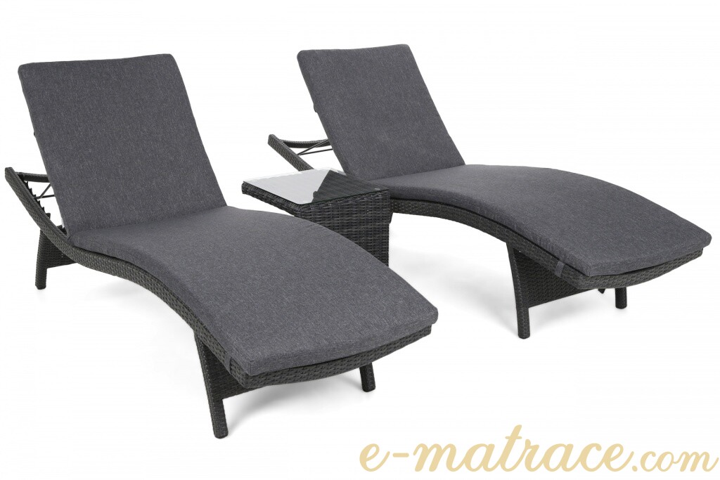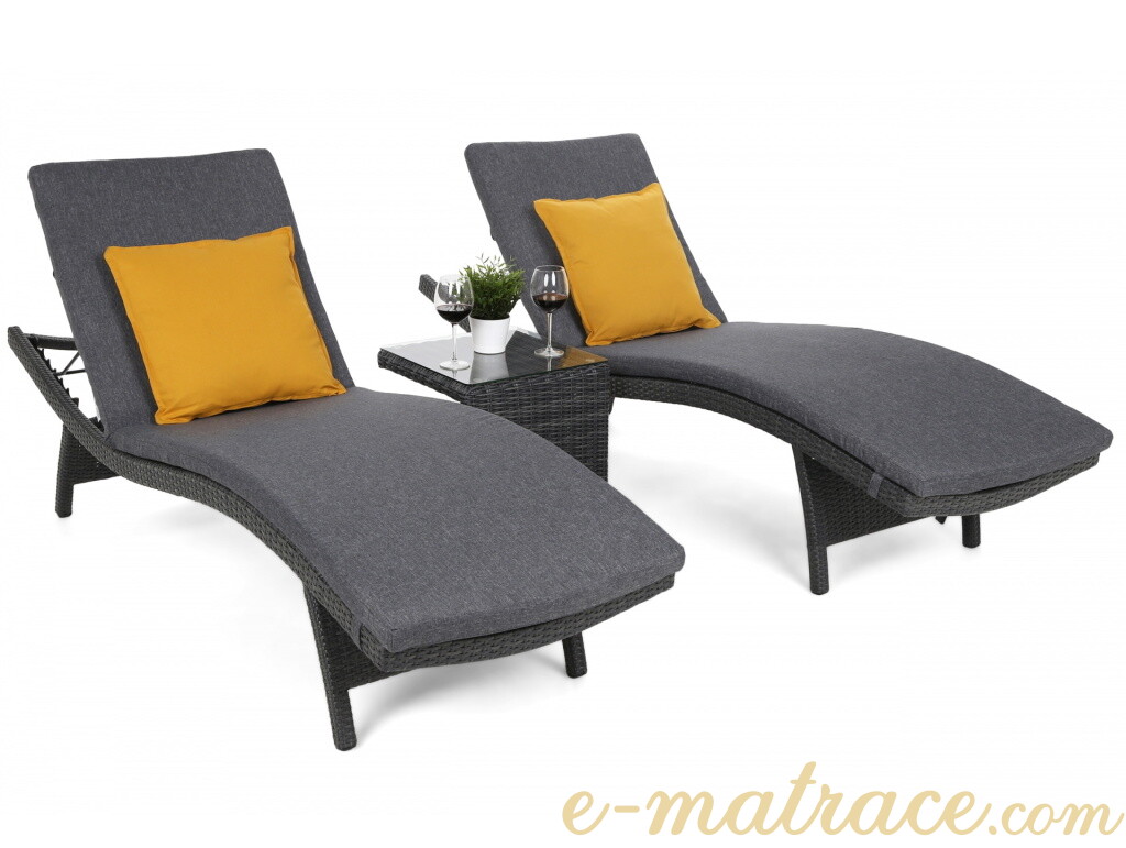 Vysoce elegantní sestava lehátek Matbella + stolek na zahradu, k bazénu nebo na pláž. Kvalitní hliníková konstrukce s opletením z technorattanu pro snadnou údržbu a dlouhou životnost. Lehátka s vícestupňovým polohováním a pohodlnými poduškami.