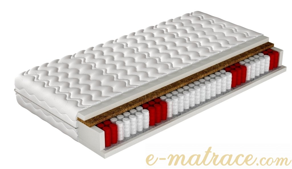 Taštičková matrace Eskada složená z kokosové desky a PUR (polyuretanové) pěny se 7 zónami tuhosti.