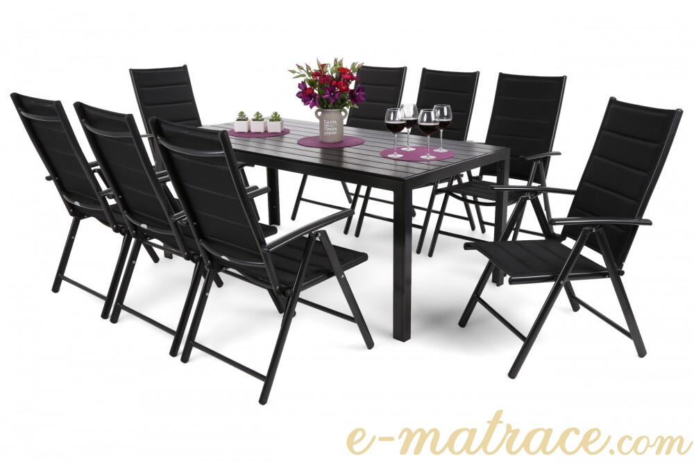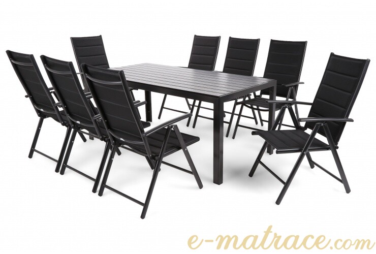 Zahradní sestava Ibiza Black / Black zaujme moderním vzhledem a akční cenou. Sestava obsahuje osm polohovatelných židlí a zahradní stůl. Stůl i židle jsou vyrobeny z hliníku stříbrné barvy. Hliníková konstrukce je pevná ale zároveň lehká, s nábytkem lze tedy snadno manipulovat. Materiál je velmi odolný a snadný na údržbu, stačí zahradní nábytek omýt teplou vodou a čistícím přípravkem. Deska zahradního stolu je složena z prken WPC materiálu, která neabsorbují vodu. Díky tomu bude povrch stolu vysoce odolný a vydrží mnoho let. Židle jsou čalouněné, speciální textilie je voděodolná a nedeformuje se.