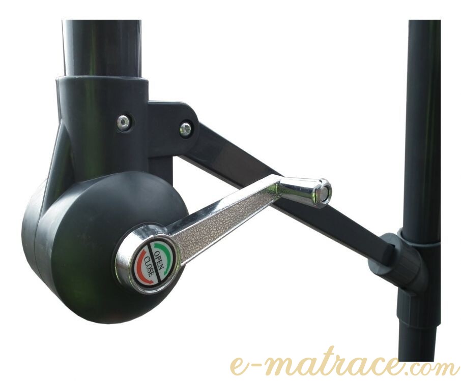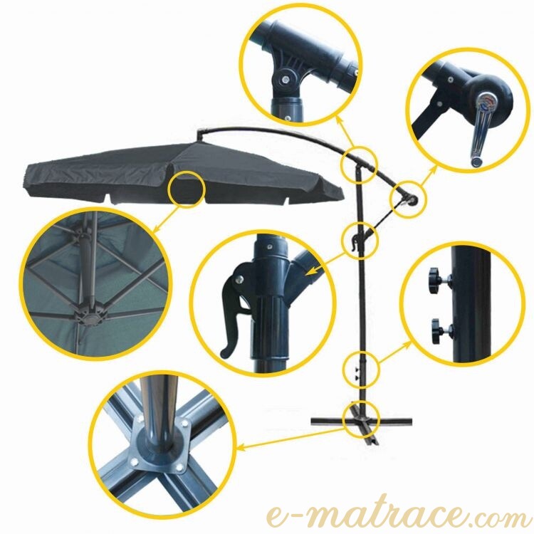 Zahradní slunečník 350 cm jako praktické a stylové řešení k ochraně před slunečními paprsky. Slunečník je vyroben z polyesteru o hustotě 180 g/m3. Díky tyči konstrukce s průměrem 38 mm lze deštník připevnit na stojan nebo stůl s otvorem na slunečník. Konstrukce je dále vybavena 6 odolnými rameny. Výšku, ve které se nachází vrchlík deštníku, a úhel jeho sklonu se regulují speciální rukojetí. Použití mechanismu s klikou umožňuje snadné a rychlé rozložení konstrukce.